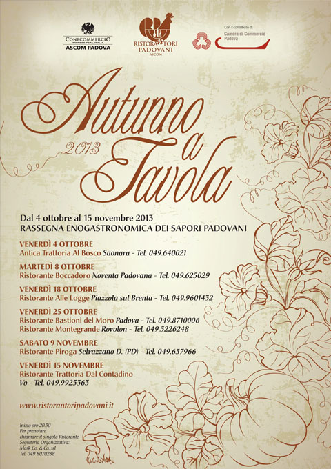 Puntuale con l’autunno torna la rassegna enogastronomica dei Ristorantori Padovani dell’Ascom “Autunno a Tavola”. L’iniziativa, che gode del contributo della Camera di Commercio, prenderà avvio venerdì 4 ottobre e si concluderà venerdì 15 novembre e prevede una serie di serate a tema con la presentazione di un menu a base di prodotti di stagione che comprenderanno la zucca, i funghi, il melograno, le castagne, i carciofi e molto altro ancora. “Il nostro obiettivo – ha affermato Giorgio Borin, presidente del Gruppo Ristorantori Padovani dell’Ascom – è quello di proporre ai nostri clienti e a chi non ci conosce una cucina dai caratteri tradizionali ma che riesce ad innovarsi con gusto e ingredienti di qualità”.