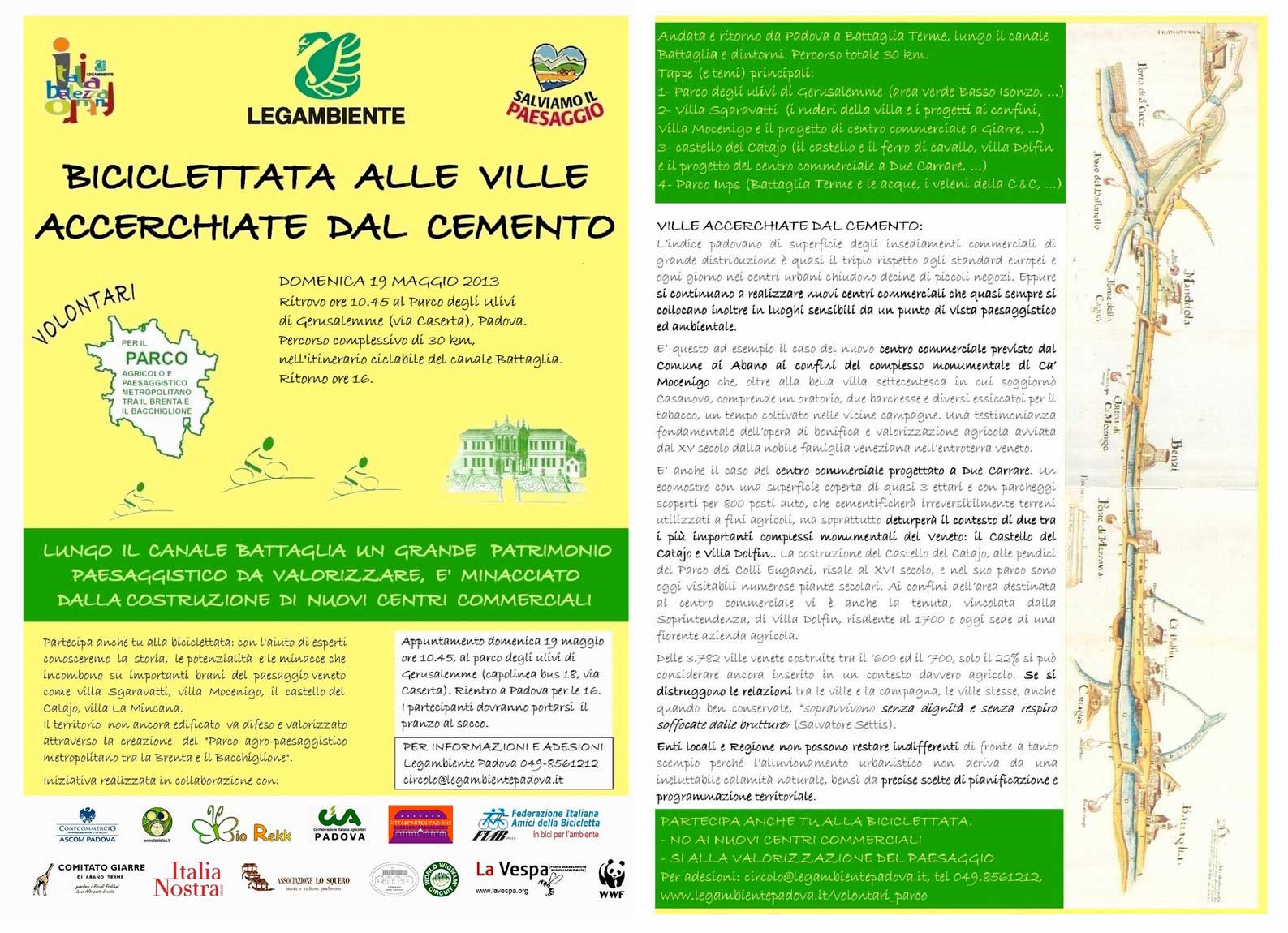 La biciclettata partirà da Padova alle ore 10.45 presso il Parco degli Ulivi (zona Basso Isonzo) per raggiungere Battaglia Terme e dintorni.