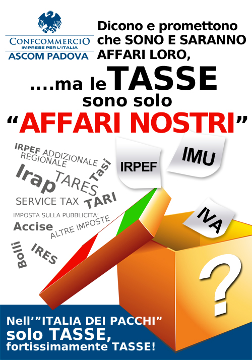 GIOVEDI’ 10 OTTOBRE, ALLE ORE 10.30 L’ASCOM CONFCOMMERCIO DI PADOVA PORTA IN PIAZZA GARIBALDI, CON IRONIA, LA PROTESTA CONTRO LE TASSE. LO FARA’ CON LA PARODIA DEL GIOCO DEI PACCHI, RINOMINATO, PER L’OCCASIONE “AFFARI NOSTRI”.