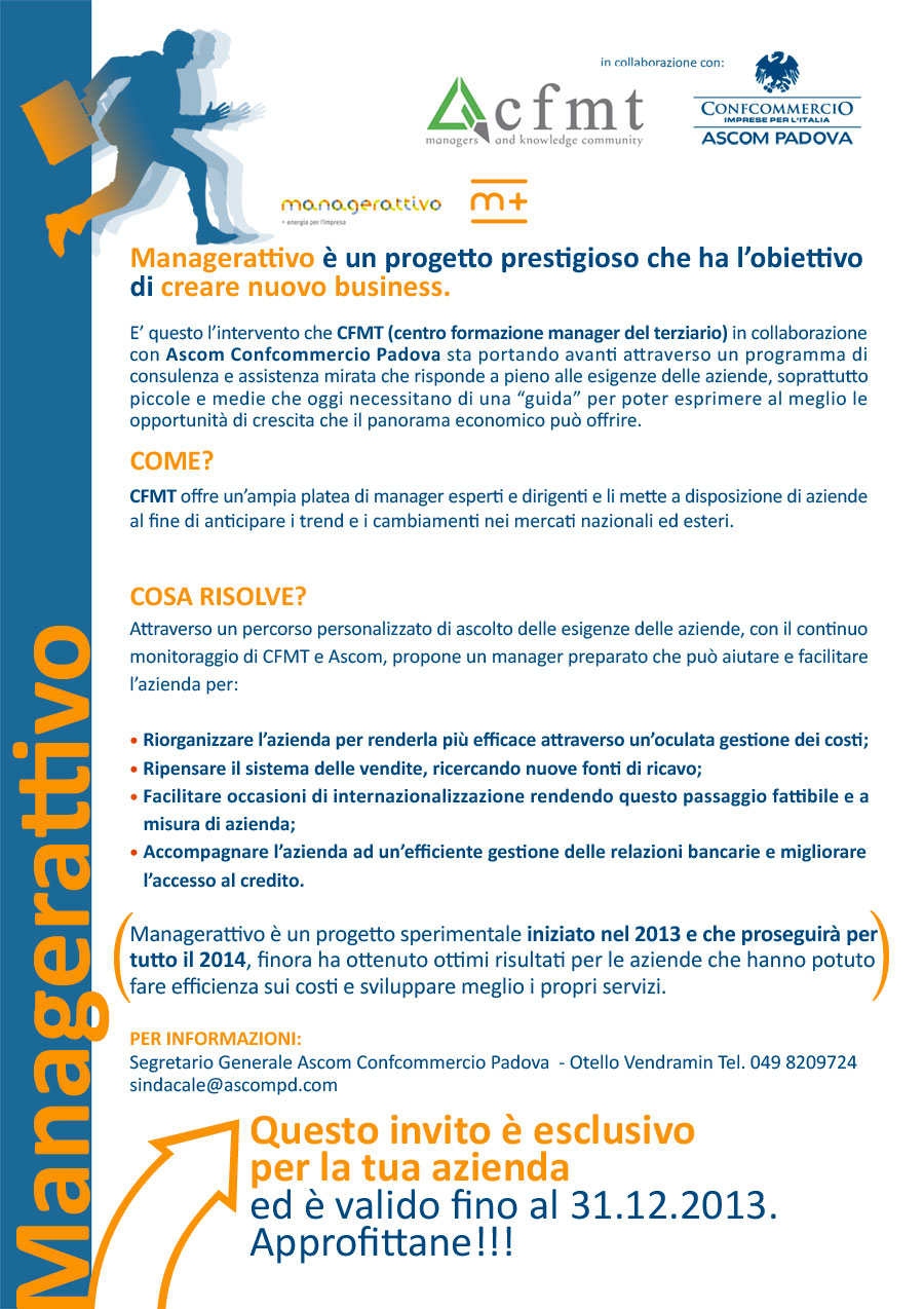 Un progetto prestigioso e con l’obiettivo di creare business. E’ questo l’intervento che CFMT (centro formazione manager del terziario) in collaborazione con Ascom Confcommercio Padova sta portando avanti attraverso un programma di consulenze e assistenza che risponde a pieno alle esigenze delle aziende, grandi e piccole che oggi più che mai necessitano di una “guida” per poter esprimere al meglio le opportunità di crescita che il panorama economico può offrire.Ma come interviene CFMT che non rappresenta solo una sigla ma un team di manager esperti nell’anticipare i trend e i cambiamenti nei mercati nazionali ed esteri? interviene ascoltando le aziende e le loro necessità, attraverso l’avvio di nuove strategie di organizzazione, con innovazione e con nuove modalità per allargare la clientela. Queste sono solo alcuni esempi di azioni, peraltro già in atto con alcune ditte associate, che stanno producendo ottimi risultati. Managerattivo è un progetto sperimentale nato nel 2013 e che proseguirà per tutto il 2014: per informazioni si prega di prendere contatti direttamente con il Segretario Generale Ascom dott. Otello Vendramin al numero 049.8209724 oppure inviare una mail all'indirizzo Questo indirizzo email è protetto dagli spambots. È necessario abilitare JavaScript per vederlo.