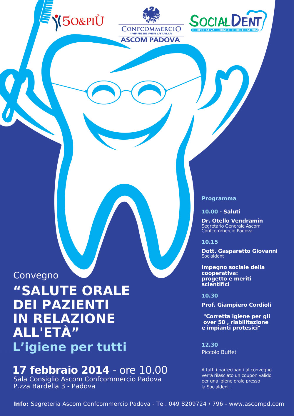 E’ perfettamente in tema, pertanto, il convegno sull'igiene dentale che si terrà lunedì 17 febbraio alle 10 all’Ascom di Padova in piazza Bardella, rivolto ad un target vasto e variegato, con l’obiettivo di dare informazioni serie ed efficaci per la cura e l’igiene della propria bocca.