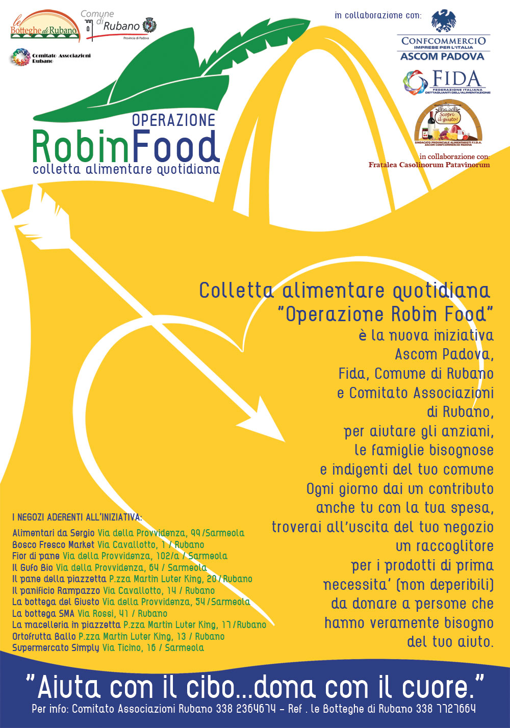 Prende simpaticamente spunto dalla filosofia generosa dell’eroe di Sherwood l’operazione Robin Food, una colletta alimentare destinata a dare aiuto immediato e concreto alle persone in difficoltà residenti nel comune della cintura, inaugurata oggi grazie alla sinergia tra Confcommercio Ascom Padova, FIDA, ovvero la Federazione Italiana dettaglianti dell’Alimentazione Ascom e il Comitato Associazioni di Rubano, in collaborazione con il Comune di Rubano e Fratalea Casolinorum Patavinorum, sempre dell’Ascom.