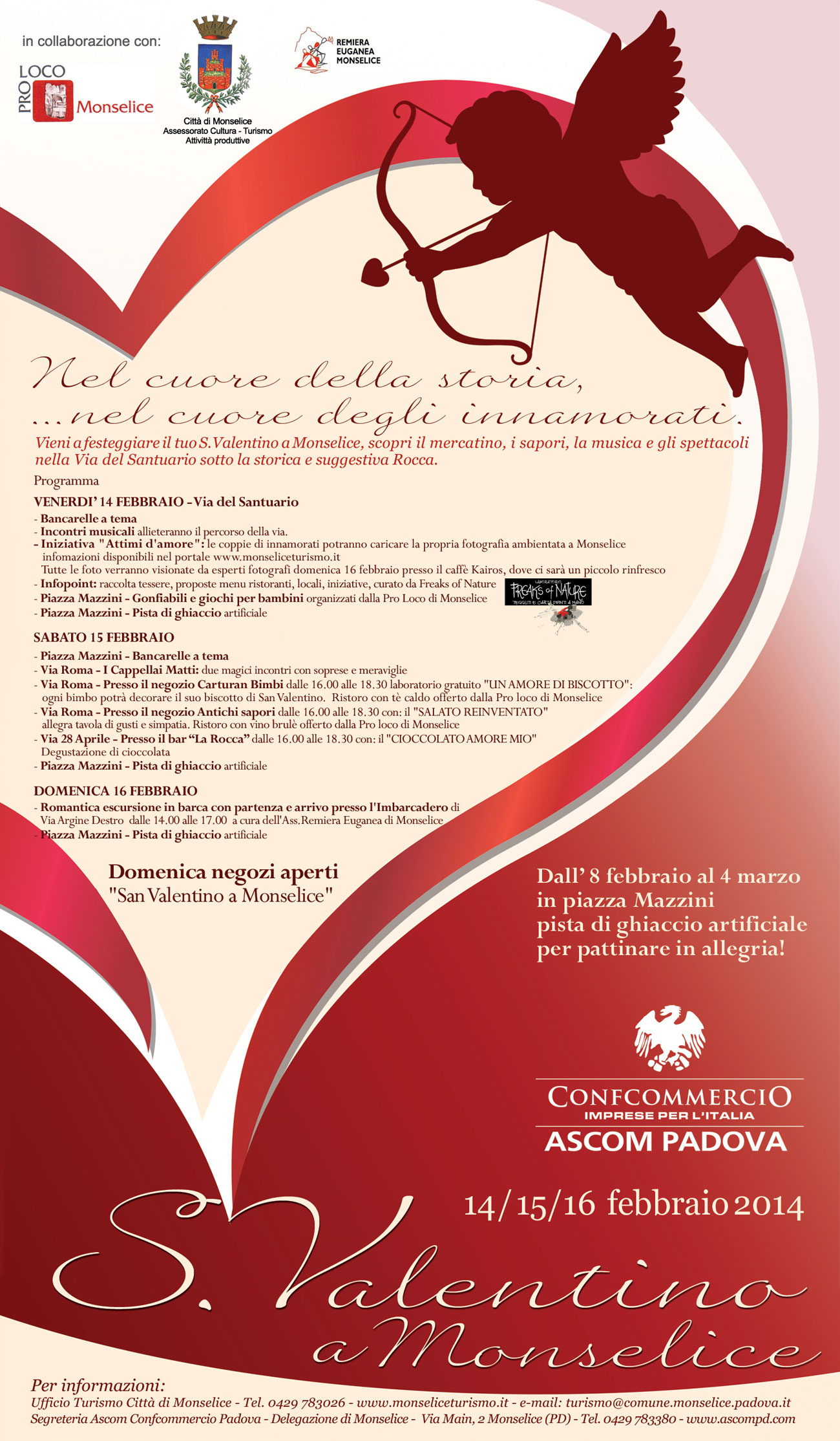E proprio nella città della Rocca, all’interno del cui santuario era tradizione benedire le chiavette a lui dedicate, da venerdi 14 a domenica 16 febbraio si terranno, grazie alla collaborazione tra Ascom Comune e Pro Loco, una serie di eventi legati a questa romantica ricorrenza, dedicati a grandi e piccini, che coinvolgeranno le principiali realtà commerciali monselicensi e permetteranno di trascorrere un week end all’insegna del gusto, della musica, del divertimento e degli appuntamenti gastronomici dedicati.