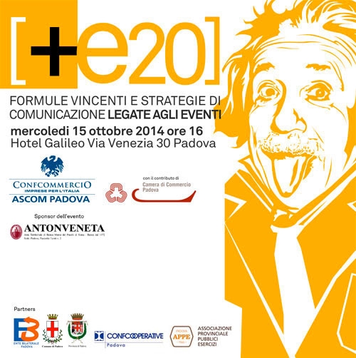 [+E20] - FORMULE VINCENTI E STRATEGIE DI COMUNICAZIONE LEGATE AGLI EVENTI: è infatti un convegno pensato appositamente per dare linee guida che riescano a rendere attrattivo un evento partendo dalla sua ideazione e organizzazione, per rendere visibile la propria azienda all’interno della promozione di un evento, per imparare a mettersi in gioco e non essere semplici spettatori. Si terrà mercoledì 15 ottobre ore 16.00 – c/o Hotel Galileo Via Venezia 30 Padova, grazie all’organizzazione di Confcommercio Ascom Padova con il contributo della Camera di Commercio, la sponsorizzazione di Banca Antonveneta e la collaborazione di Ente Bilaterale, Comune e Provincia di Padova, Confcooperative Padova e Appe e vedrà alternarsi, dopo i saluti del presidente Ascom Patrizio Bertin, i contributi del consulente aziendale Matteo Rinaldi, del consulente di Iscom Group Marco Leoni e di Enrico Candeloro, CEO presso World Appeal.