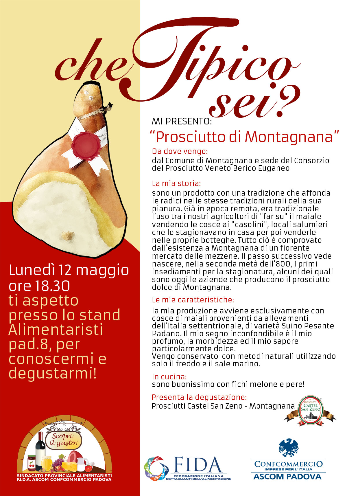 Oggi pomeriggio a partire dalle ore 18,30 nel PalaAscom presso il Punto Gusto, l'area che ospita gli Alimentaristi, verrà presentato, nell'ambito del progetto "Che tipico sei?" - viaggio nel mondo delle eccellenze e unicità gatronomiche del territorio, il Prosciutto di Montagnana, a cura dei Prosciutti Castel San Zeno di Montagnana, con degustazione finale.