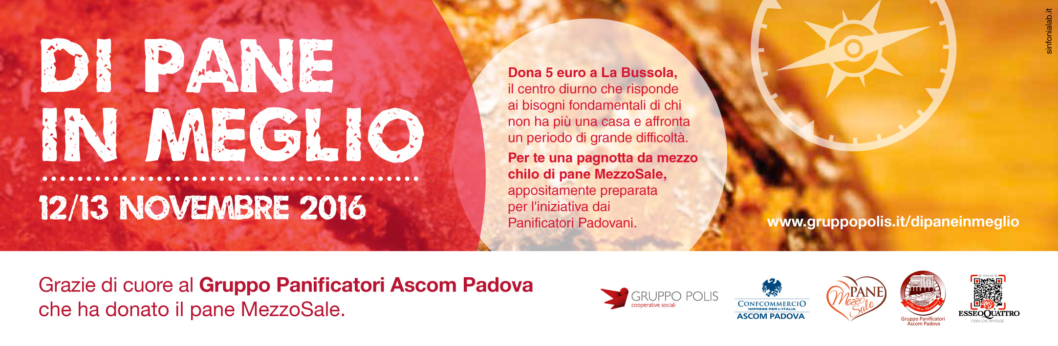 PANE IN MEGLIO: IL PROGETTO DEL GRUPPO POLIS CON I PANIFICATORI ASCOM PADOVA che hanno realizzato il Pane Mezzo Sale appositamente per raccogliere fondi destinati a chi non ha più casa, davanti alle parrocchie di Padova e provincia il 12 e il 13 novembre.