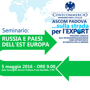 Stefano Traverso analizzerà il percorso guidato sull’internazionalizzazione ideato da Ascom Padova, mentre Dave Righetto, export project manager & program manager, si soffermerà sugli aspetti geopolitici di Russia e Paesi dell’Est Europeo, per condurre una efficace analisi di mercato.