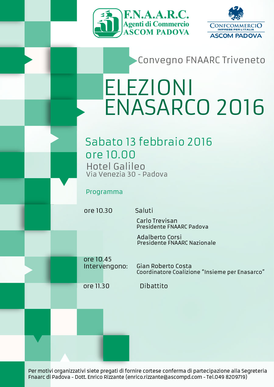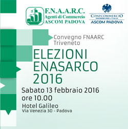 La coalizione della lista “Insieme per Enasarco” organizza per sabato prossimo, 13 febbraio 2016, alle ore 10.30, all’Hotel Galileo di Padova (via Venezia), un convegno nel corso quale verranno illustrate le tematiche che sono collegate alle prossime elezioni dell'Assemblea dei Delegati in seno alla Fondazione Enasarco, previste per il periodo compreso fra il 1° e il 15 aprile 2016.