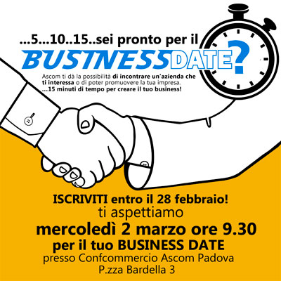 "BUSINESS DATE”, LO SPEED DATE PER LE AZIENDE IN CERCA DI BUSINESS VA IN SCENA ALL’ASCOM IL 2 MARZO CON LO SLOGAN “CREA IL TUO BUSINESS IN 15 MINUTI”