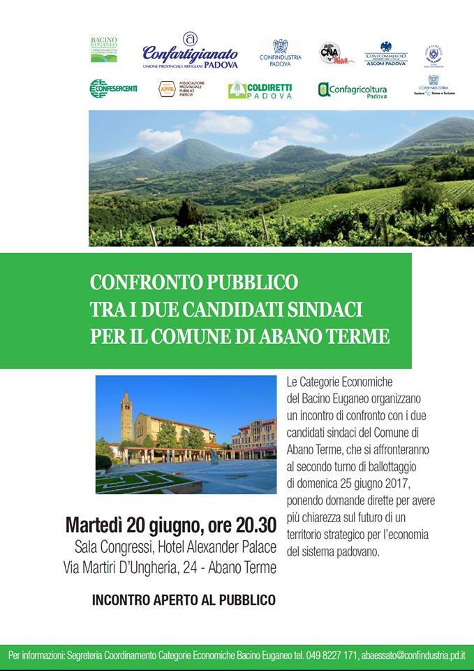 Martedì 20 giugno a partire dalle 20,30, nella Sala Congressi dell’Hotel Alexander ad Abano Terme, si terrà l’incontro promosso dalle Categorie Economiche del Bacino Euganeo con i due candidati sindaco del Comune di Abano Terme, che si affronteranno al ballottaggio di domenica 25 giugno.