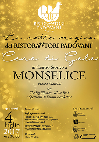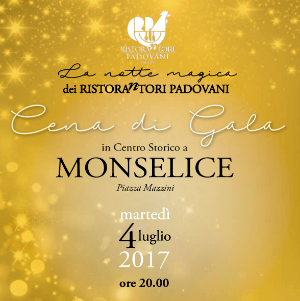 Dopo il successo delle edizioni passate anche quest’anno torna con la settima edizione “La Cena di Gala sotto le stelle”, uno degli appuntamenti culinari più importanti del nostro territorio. Sullo sfondo di Piazza Mazzini, a Monselice, martedì 4 luglio 2017 a partire dalle ore 20.00 avrà luogo la cena di gala, accompagnata da intrattenimento musicale e spettacoli di danza.