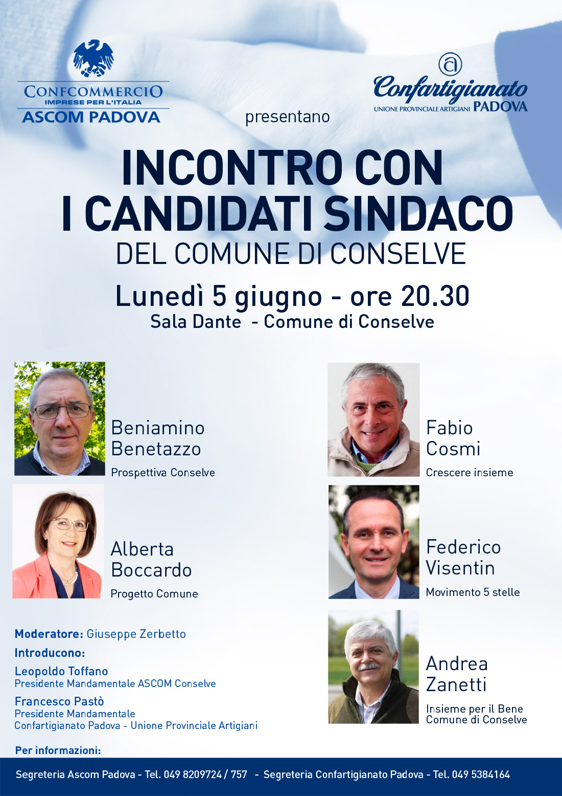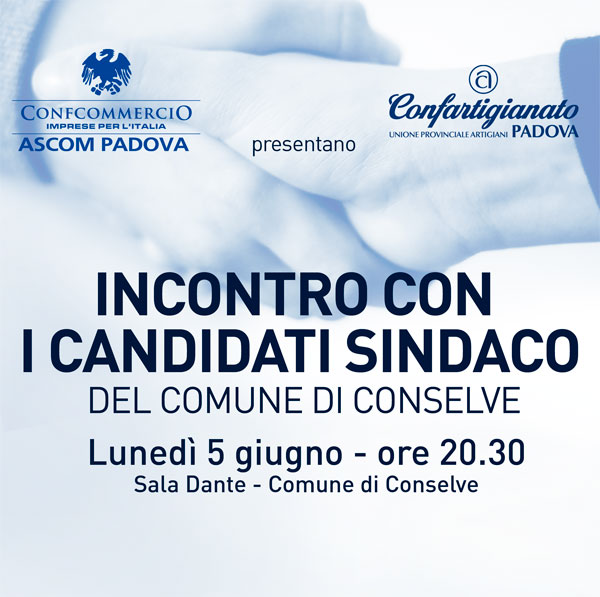 Lunedì 5 giugno a partire dalle ore 21 nella Sala Dante del Comune di Conselve si terrà l’incontro con i canidati alla carica di Sindaco per le prossime amministrative, organizzato da Confcommercio Ascom Padova in sinergia con Confartigianato.