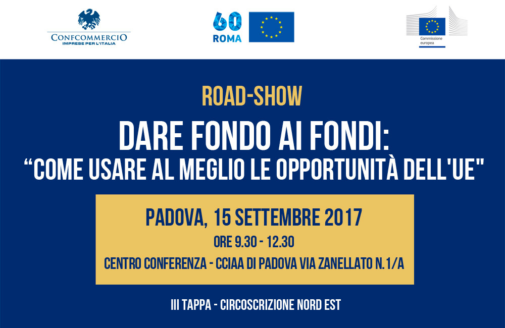 In occasione dei 60 anni dalla firma dei trattati di Roma Confcommercio Imprese per l’Italia, con il supporto della propria delegazione presso l’UE e della rappresentanza in Italia della Commissione europea, ha avviato un road-show dal titolo "Dare fondo ai fondi: come usare al meglio le opportunità dell'UE", di cui Padova ospita il 15 settembre la terza tappa.