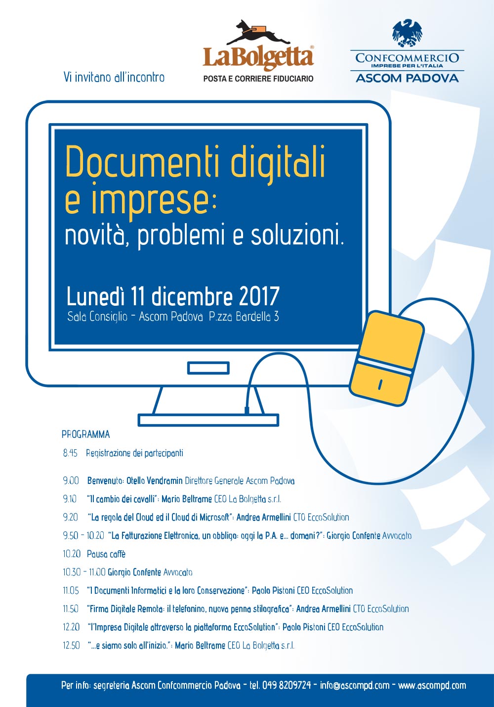L’11 dicembre prossimo dalle ore 8,45 si terrà presso l’Ascom di Padova un interessante incontro sulla digitalizzazione delle imprese, organizzato da Confcommercio Ascom Padova assieme a La Bolgetta.