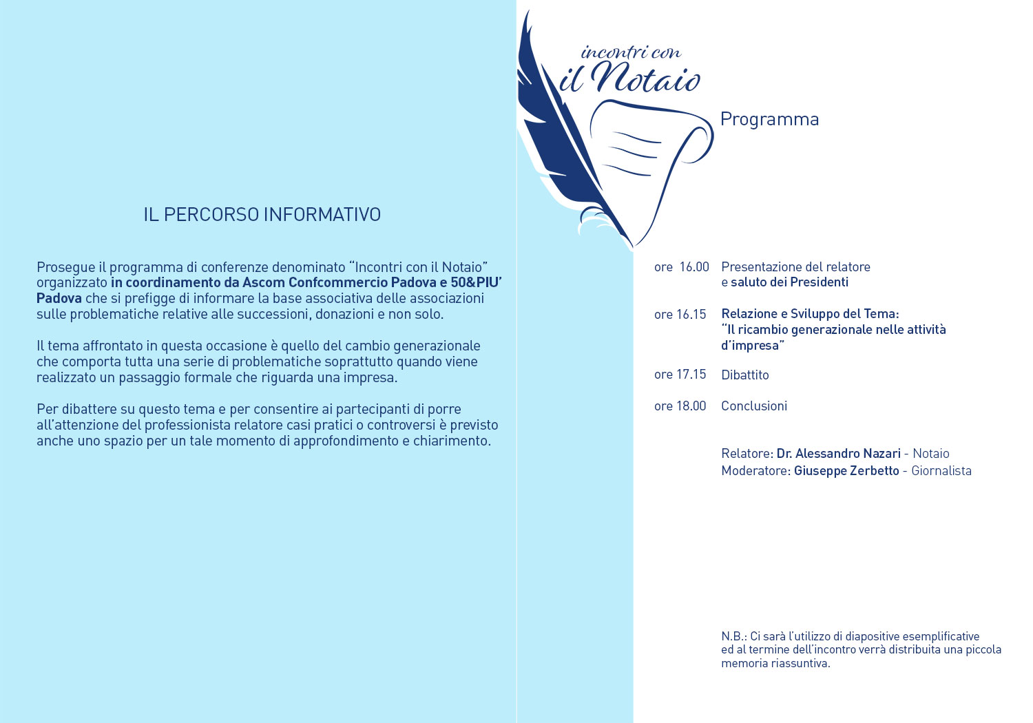 Lunedì 29 il notaio dr. Alessandro Nazari parlerà degli aspetti legati al ricambio generazionale nelle attività di impresa.