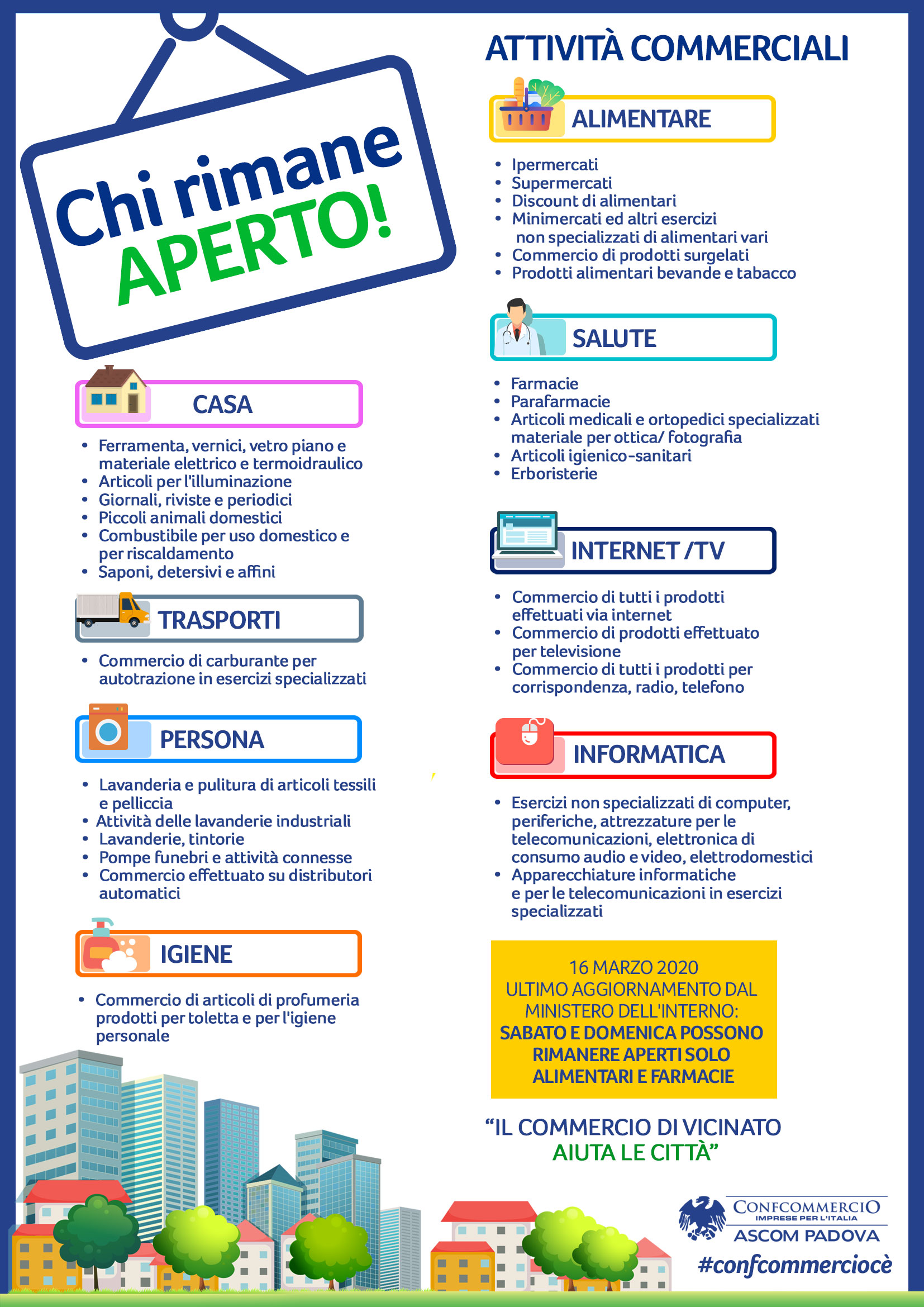 comparativa delle vecchie e grandi strutture di vendita e prezzi. Il nuovo provvedimento stabilito nei giorni festivi e prefestivi è incluso all'interno di queste strutture (esercizi sopra i 250 mq e centri commerciali) attività commerciali del settore alimentare, prodotti farmaceutici e parafarmacie, sempre nel rispetto delle distanze di sicurezza, in ogni forma di assembramento.