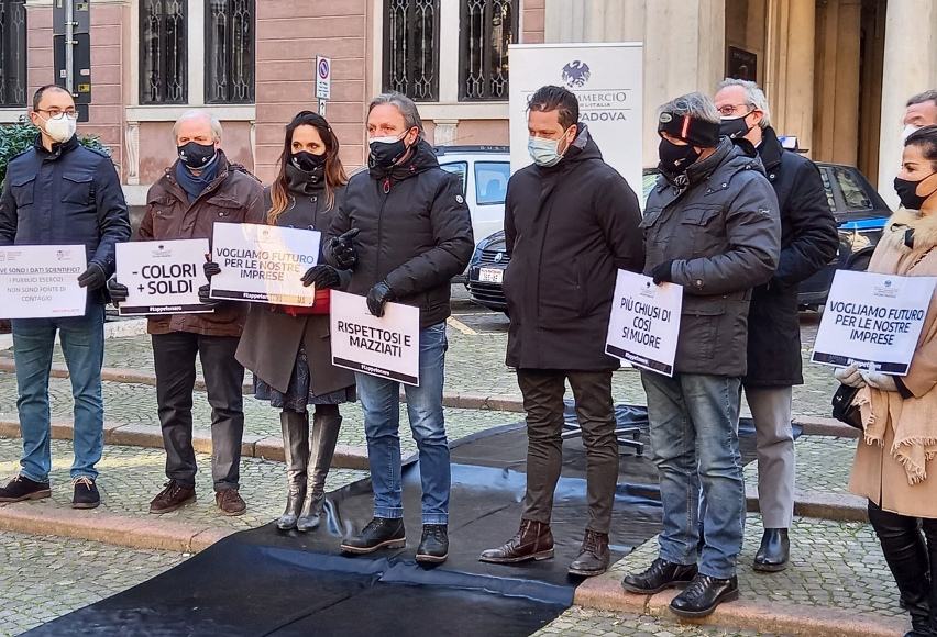 Così, per rappresentare una condizione di estrema difficoltà, le sigle di Confcommercio (Ascom e Appe) questa mattina hanno organizzato un incontro con la stampa davanti alla Prefettura di Padova, sede territoriale del governo, dove, per richiamare l’attenzione su una situazione ormai insostenibile, hanno steso venti metri di tappeto: prima giallo, poi arancione, quindi rosso ed infine, molto più lungo dei primi tre, nero.