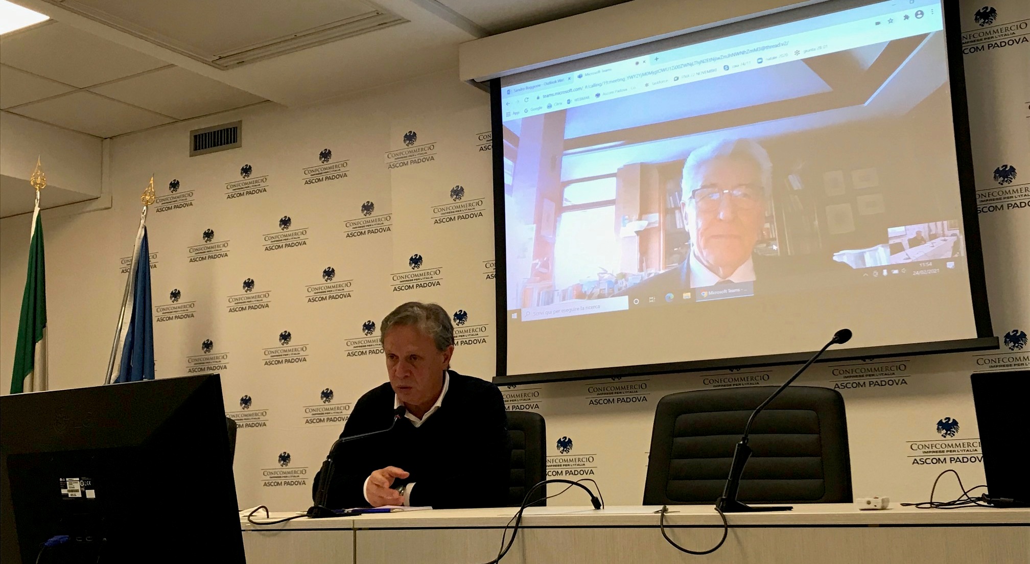 A confrontarsi in collegamento da remoto col presidente dell’Ascom, Patrizio Bertin, il presidente della Fondazione Cassa di Risparmio, Gilberto Muraro.