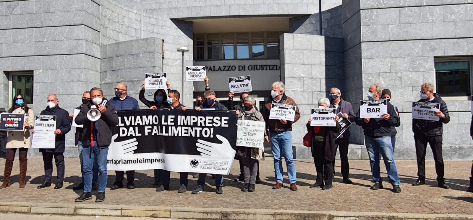 C’erano praticamente i rappresentanti di tutti i settori dell’Ascom Confcommercio questa mattina davanti al Tribunale di Padova per il flash mob organizzato per ribadire che le imprese sono allo stremo e che il passo successivo non può essere che “portare i libri in tribunale” e dichiarare fallimento.