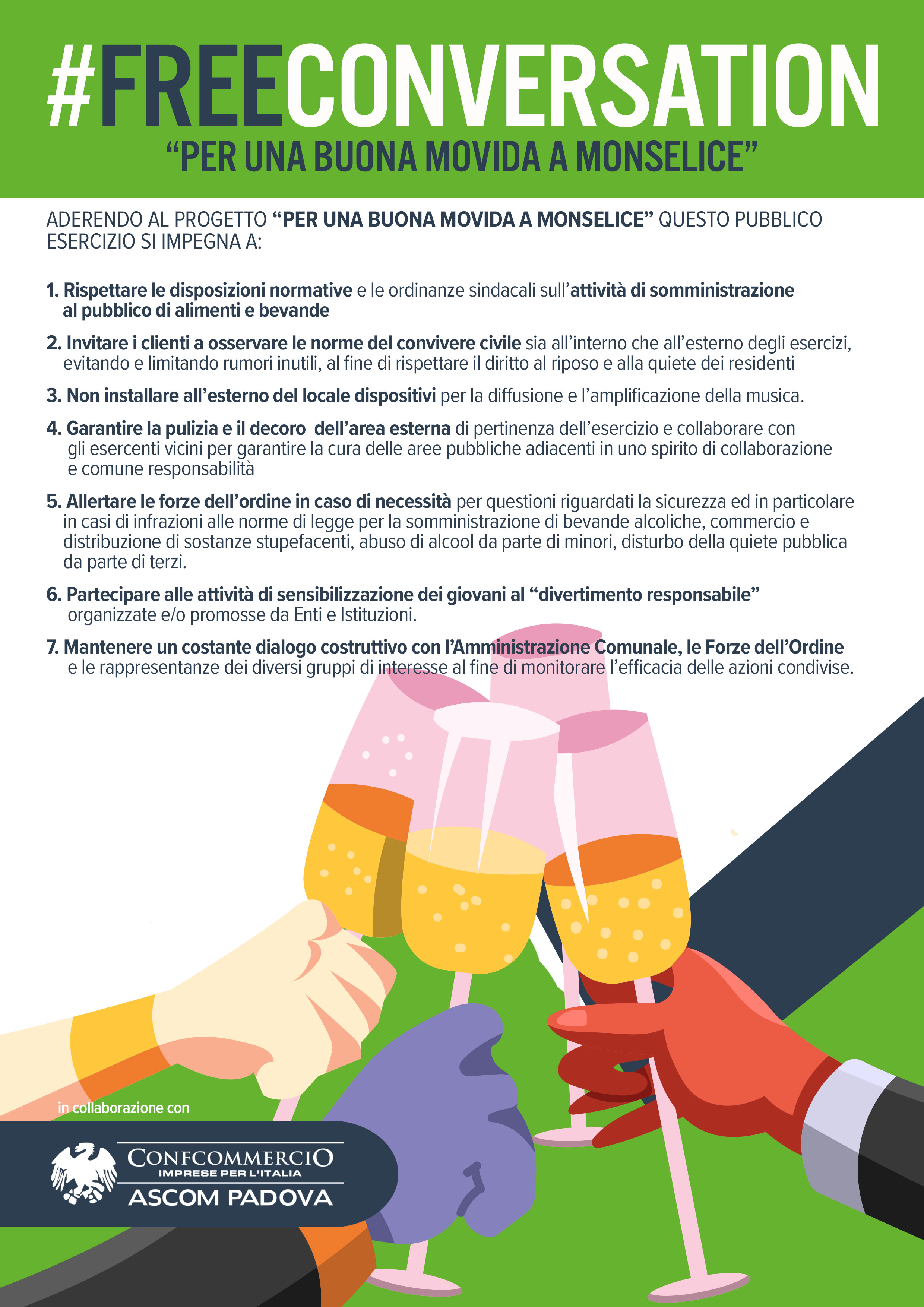 Ecco che allora, per sostenere il rispetto delle disposizioni normative relative all’attività di somministrazione al pubblico di alimenti e bevande, un gruppo di locali di Monselice aderenti all’Ascom Confcommercio ha promosso l’iniziativa “#FREE CONVERSATION – Per una buona movida a Monselice”.