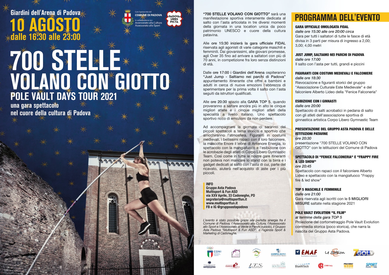 “700 stelle volano con Giotto” sarà una manifestazione sportiva interamente dedicata al salto con l’asta articolata in tre diversi momenti della giornata in una location unica, da poco patrimonio UNESCO e cuore della cultura patavina e si terrà martedì 10 agosto presso i Giardini dell’Arena di Padova dalle ore 16.30 alle ore 23.00.