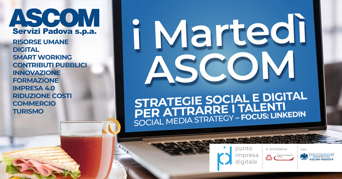 L’Ascom Servizi Padova, in collaborazione con la Camera di Commercio di Padova nell’ambito del progetto PID, organizza il webinar gratuito "Strategie social e digital per attrarre i talenti - Focus Linkedin”, il 12 ottobre dalle 13.00 alle 14.30.