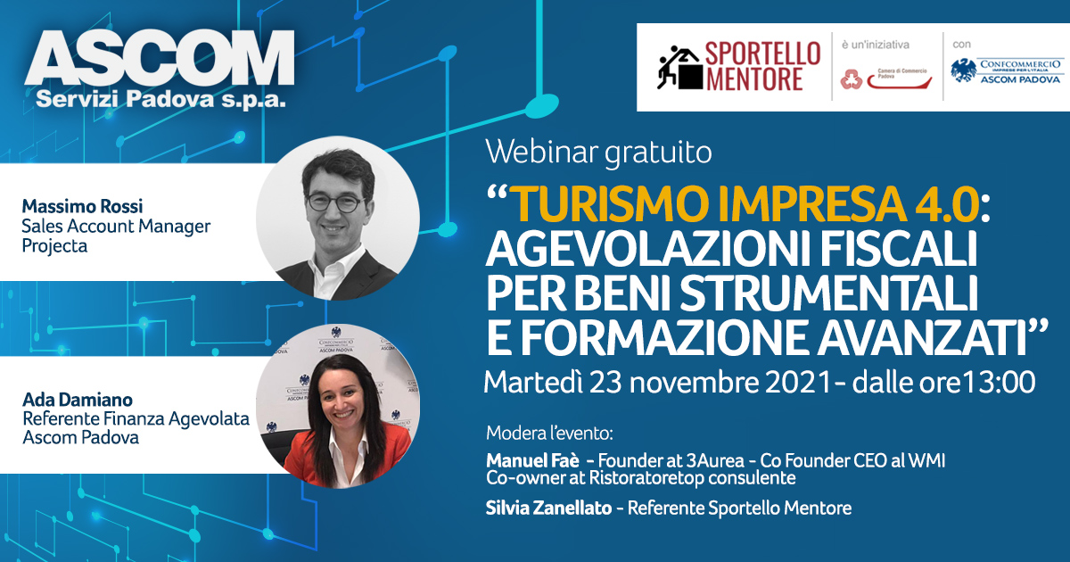 L’Ascom Servizi Padova, in collaborazione con la Camera di Commercio di Padova nell’ambito del progetto MENTORE, organizza il webinar gratuito "TURISMO 4.0: AGEVOLAZIONI FISCALI PER BENI STRUMENTALI E FORMAZIONE AVANZATI”, martedì 23 novembre alle ore 13.00.