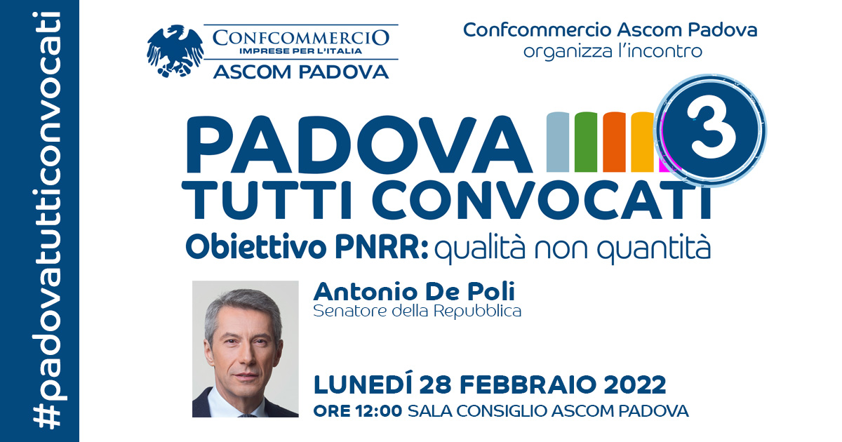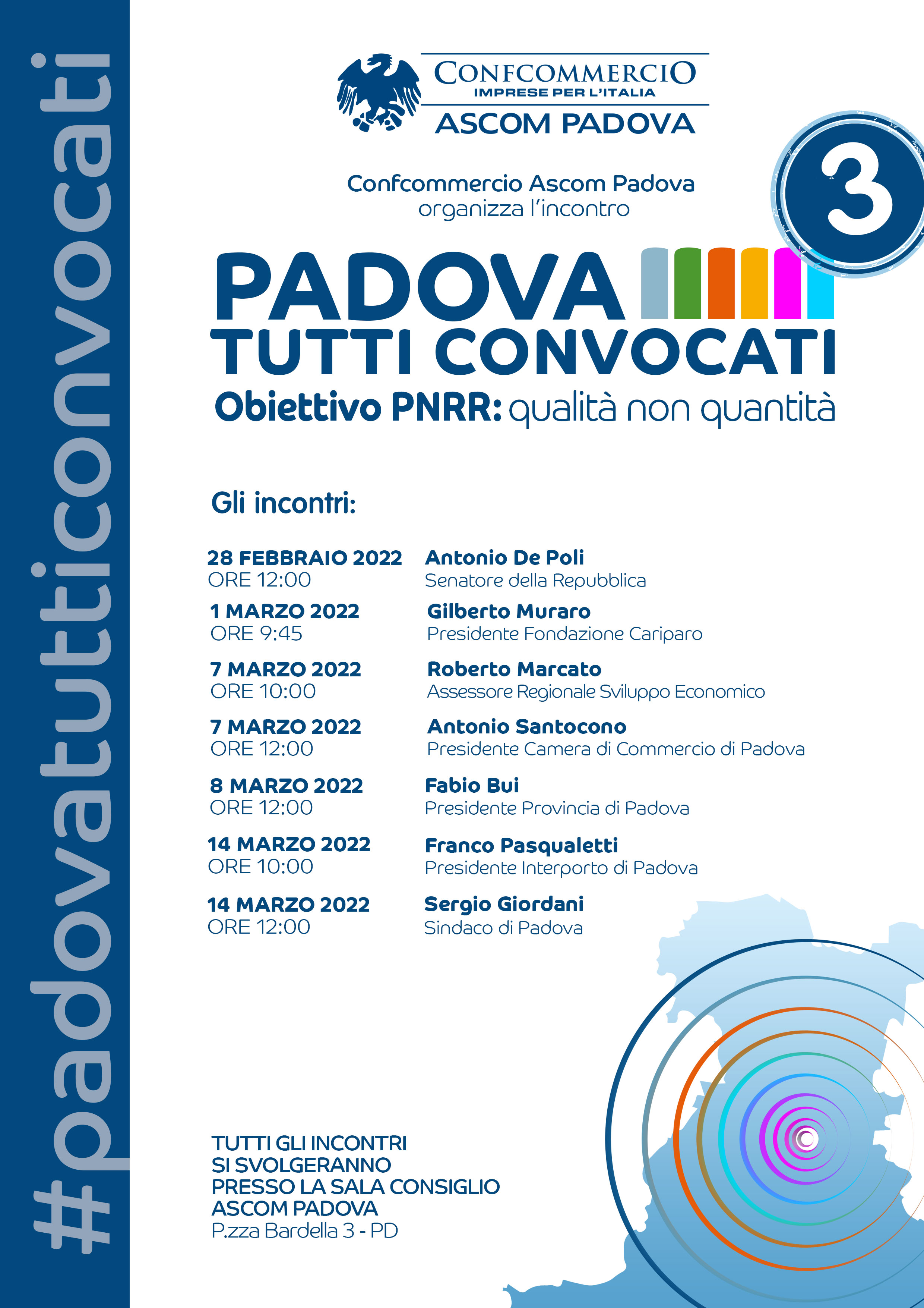 Ecco allora che, da lunedì prossimo, 28 febbraio, scatta ”Padova Tutti Convocati 3”, per l’appunto terza edizione di un format consolidato e apprezzato che, per l’occasione, sfoggia un sottotitolo inequivocabile: “Obiettivo PNRR: qualità non quantità”. Nell’arco di un paio di settimane, nella sede dell’Ascom Confcommercio di piazza Bardella, alla Stanga, verranno “convocate” figure istituzionali chiamate ad indicare, in chiave di sviluppo, le priorità (ecco il significato di “qualità”) abbandonando le facili suggestioni (ovvero la “quantità”).