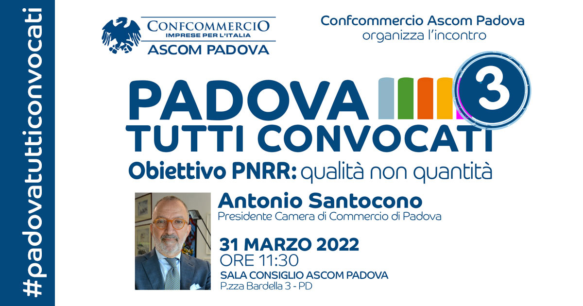 CON L’INTERVENTO DI ANTONIO SANTOCONO, PRESIDENTE DELLA CAMERA DI COMMERCIO, SI CHIUDE DOMANI, GIOVEDI’ 31 MARZO, ALLE 11.30, IL “PADOVA TUTTI CONVOCATI” DELL’ASCOM CONFCOMMERCIO