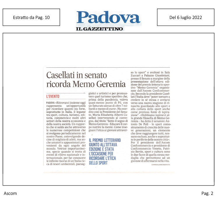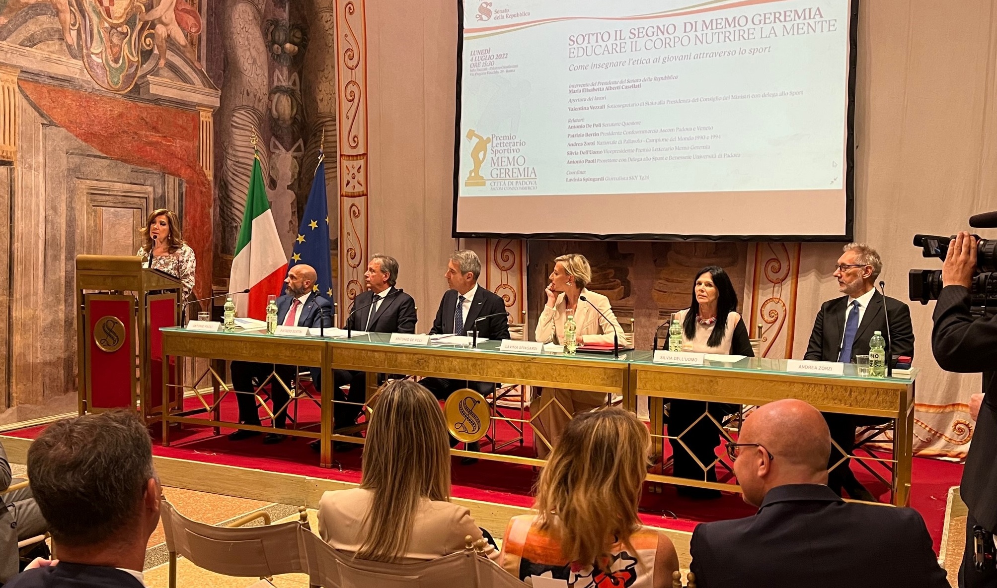Ha esordito così la Presidente del Senato, Maria Elisabetta Alberti Casellati intervenendo ieri pomeriggio al convegno, dal titolo “Sotto il segno di Memo Geremia - Educare il corpo nutrire la mente. Come insegnare l’etica ai giovani attraverso lo sport” e svoltosi in Sala Zuccari a Palazzo Giustiniani, presso il Senato a margine della presentazione dell'ottava edizione del premio letterario sportivo “Memo Geremia” organizzato dall’Ascom Confcommercio di Padova e moderato dalla giornalista di SkyTG24, Lavinia Spingardi.