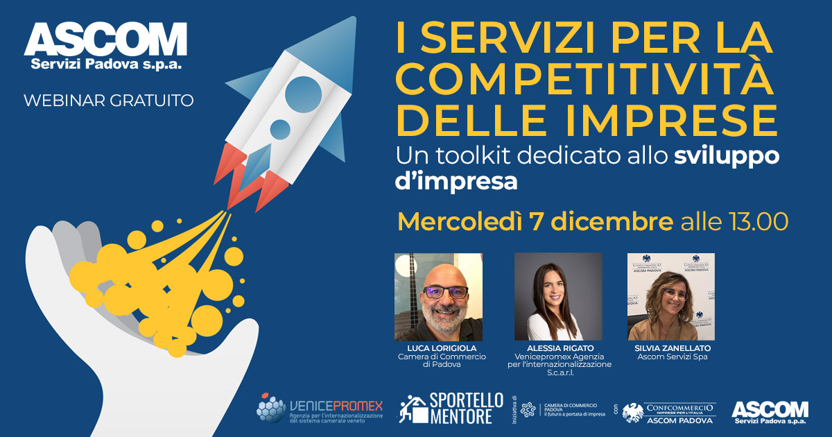Si terrà domani, mercoledì 7 dicembre, a partire dalle 13.00, il webinar dal titolo “I SERVIZI PER LA COMPETITIVITÀ DELLE IMPRESE”, organizzato da Ascom Servizi Padova spa in collaborazione con la Camera di Commercio di Padova nell’ambito del Progetto MENTORE.