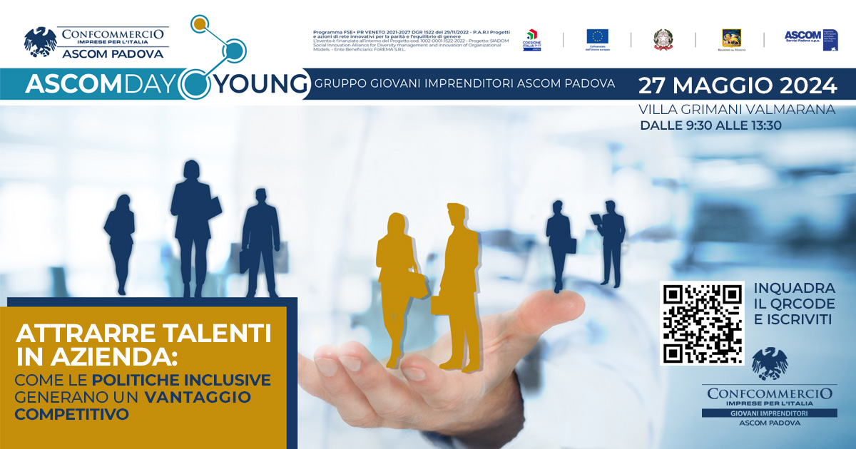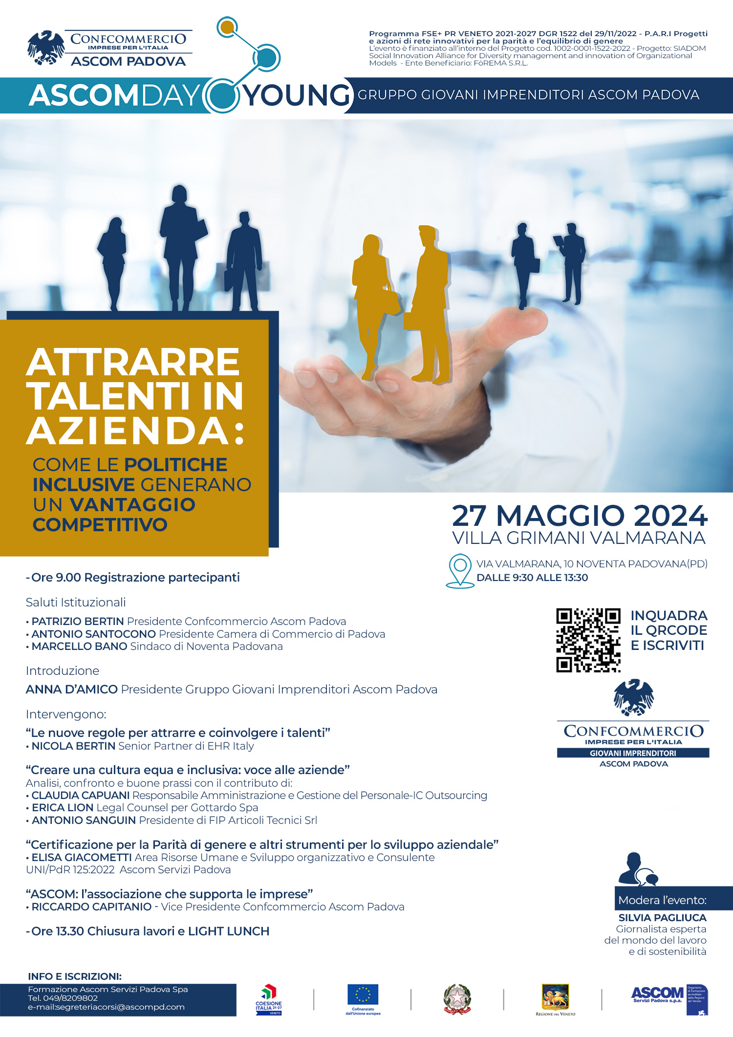 Promosso nel quadro del programma FSE+PR Veneto - P.A.R.I. Progetti e azioni di rete innovativi per la parità e l’equilibrio di genere, ad “Ascom Day Young” si può partecipare iscrivendosi alla e-mail Questo indirizzo email è protetto dagli spambots. È necessario abilitare JavaScript per vederlo. o telefonando a Formazione Ascom Servizi Padova al numero 049 8209802