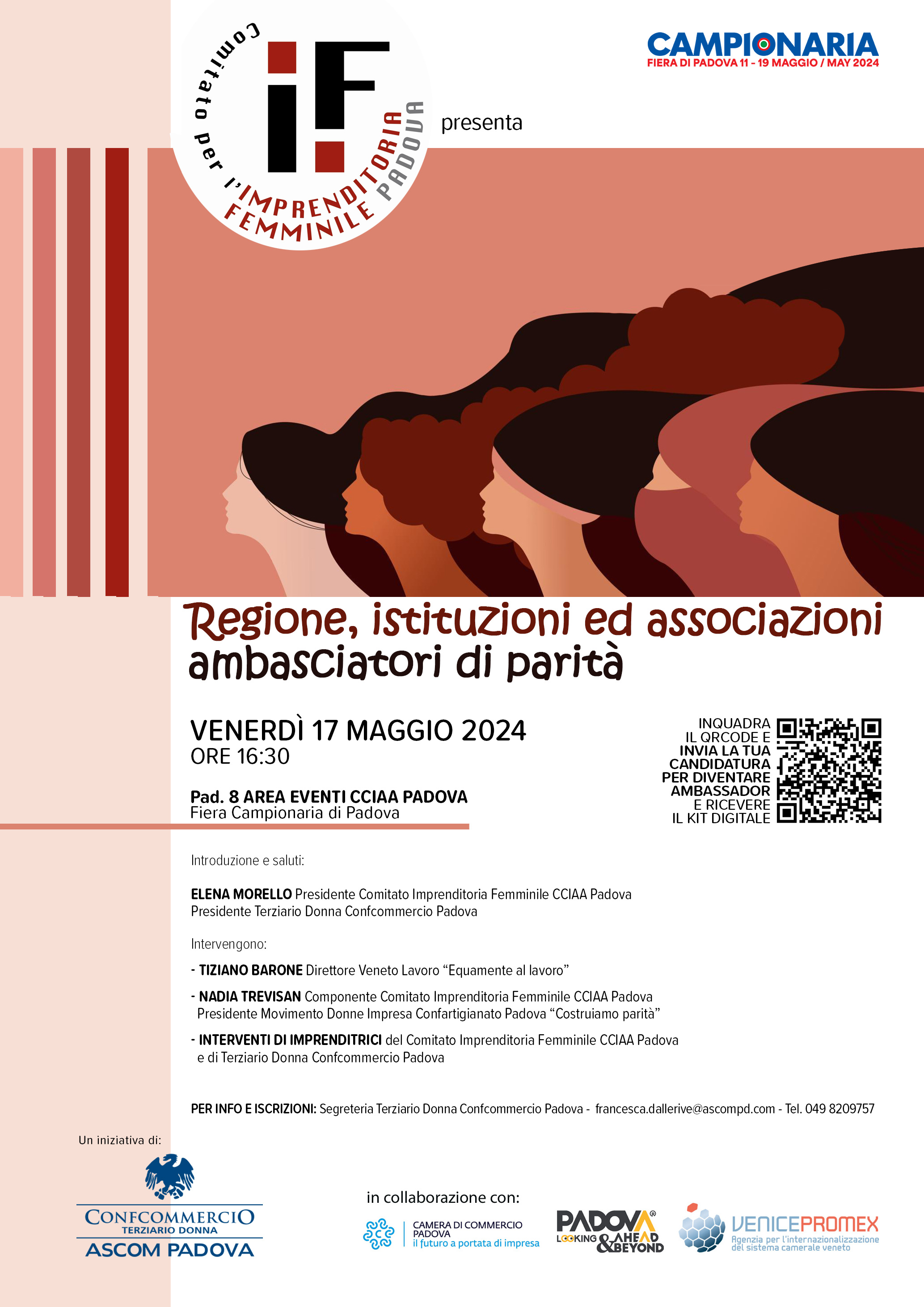 A che punto siamo con la parità di genere nei luoghi di lavoro? E, soprattutto, c’è modo per superare il gap che ancora divide donne e uomini non solo a livello di remunerazione del lavoro ma anche di incarichi apicali? Di questo si occuperà il convegno “Regione, istituzioni ed associazioni ambasciatori di parità” che il Comitato per l’Imprenditoria Femminile e Terziario Donna Confcommercio Ascom Padova hanno organizzato per venerdì 17 maggio, alle 16.30, al padiglione 8 dell’area eventi in Fiera Campionaria. All’iniziativa, che si aprirà con l’intervento di Elena Morello, presidente del Comitato e di Terziario Donna, interverranno anche Tiziano Barone, direttore di Veneto Lavoro (“Equamente al lavoro”) e Nadia Trevisan, presidente di Donne Imprese di Confartigianato. Previsti anche gli interventi di imprenditrici del Comitato per l’Imprenditoria Femminile in Camera di Commercio e di Terziario Donna Confcommercio Ascom Padova.