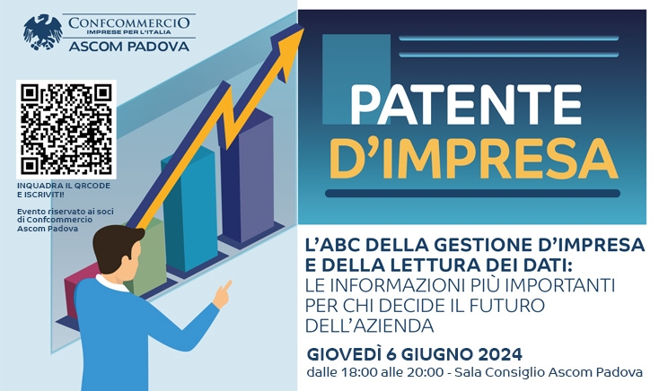 Sull’argomento “Patente d’impresa: l’ABC per la gestione d’impresa” è in programma domani, giovedì 6 giugno alle ore 18.00 presso la sede di Confcommercio Ascom Padova (Piazza Bardella).