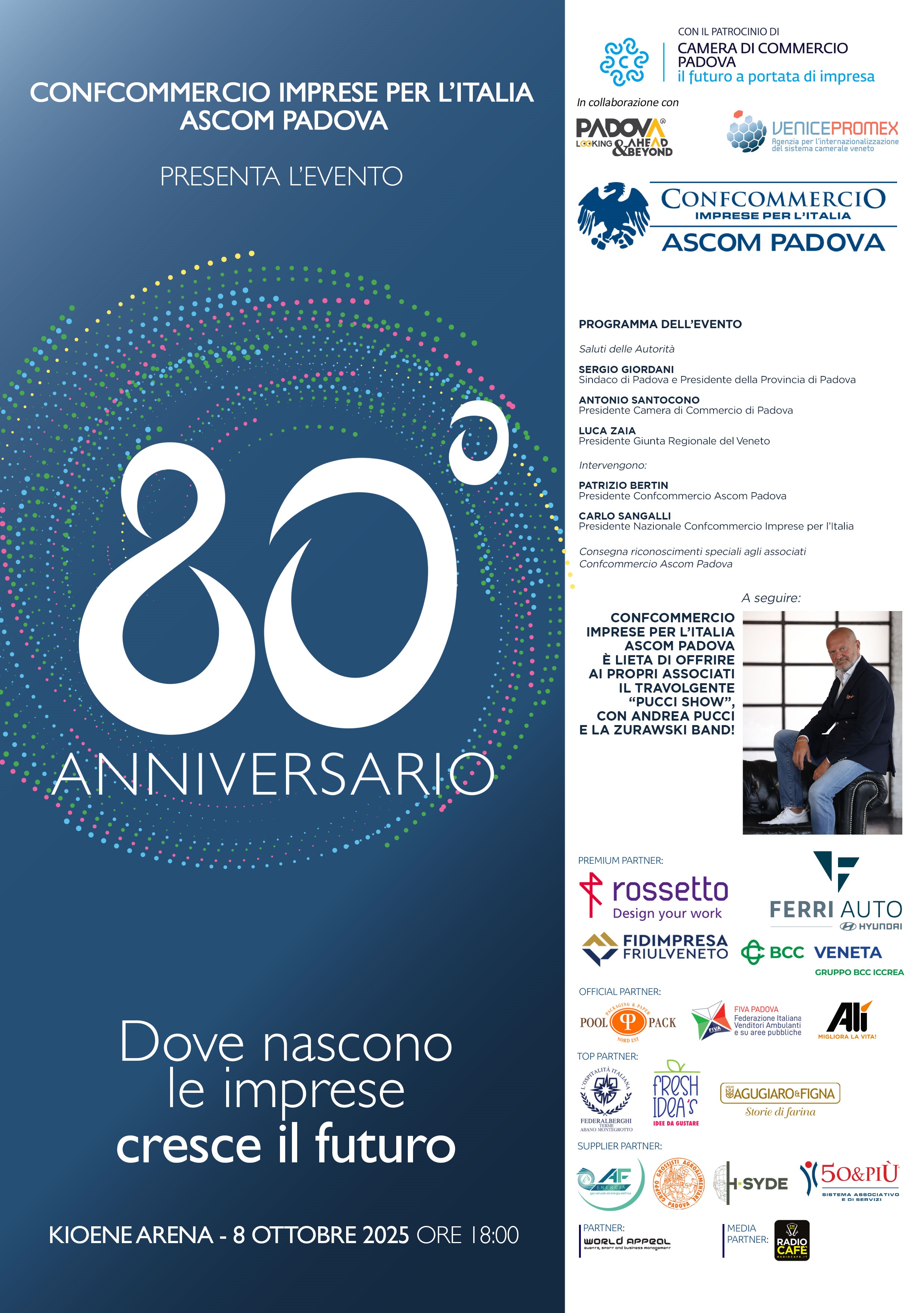 L’Ascom Confcommercio è diventata una delle più importanti organizzazioni imprenditoriali in ambito locale e delle più attive a livello nazionale. Ed è dunque grazie a questi risultati che il prossimo mercoledì 8 ottobre, l’Ascom Confcommercio, a partire dalle ore 18, al PalaSport Kioene Arena di Padova festeggerà i propri primi 80 anni.