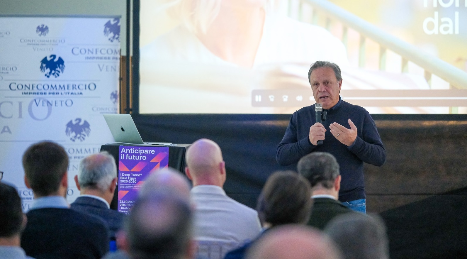 È il tema di cui si è discusso oggi, presenti una sessantina di imprenditori, al Kiubo-Villa Paola di Saonara (Padova) nella quarta edizione dei “Deep Trend® Blue Eggs 2026-2030”, l’iniziativa annuale promossa da Confcommercio Veneto in collaborazione cond Blue Eggs e Smartland. Relatrice è stata ancora una volta la prof.ssa Laura Rolle, docente di Semiotica della pubblicità all'Università di Torino, designer dei sistemi culturali e fondatrice di Blue Egss. L’analisi delle tendenze di mercato dei prossimi anni consente di dare agli imprenditori strumenti utili a progettare o rinnovare la propria strategia di business. Ad aprire l’incontro è stato il saluto del presidente di Confcommercio Veneto Patrizio Bertin.