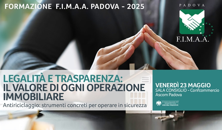 Per dopodomani, venerdì 23 maggio, a partire dalle 9.30, nella sede dell’Ascom Confcommercio in piazza Bardella, gli agenti immobiliari della Fimaa Ascom Confcommercio di Padova si riuniranno per un incontro sull’antiriciclaggio in campo immobiliare.