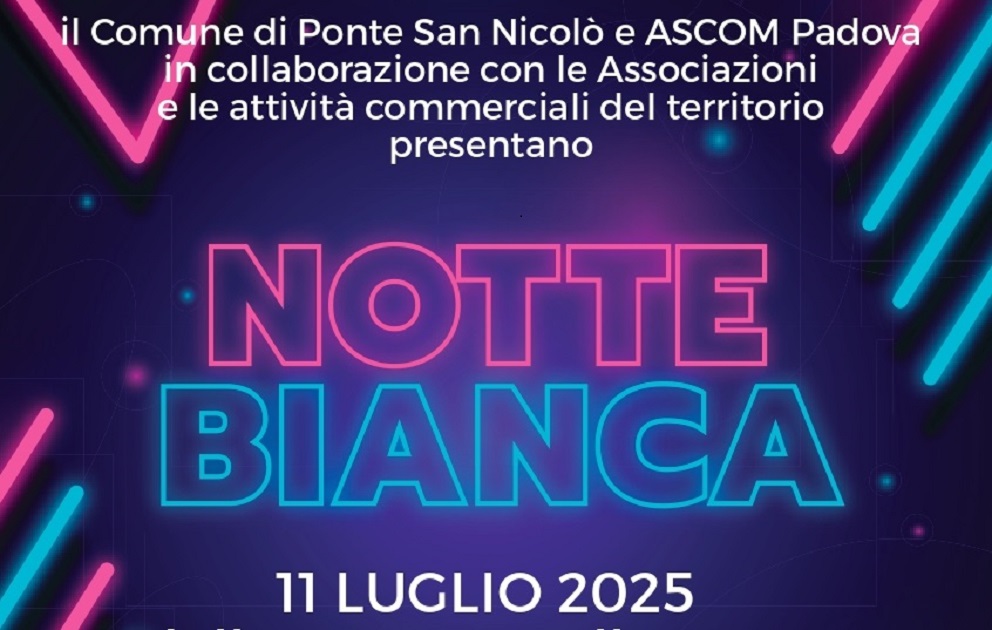 A Ponte San Nicolo’ domani, venerdì 11 luglio, dalle 19 alle 24, lungo Via Marconi (SS 516), la “Notte Bianca” organizzata dal Comune con l’Ascom Confcommercio