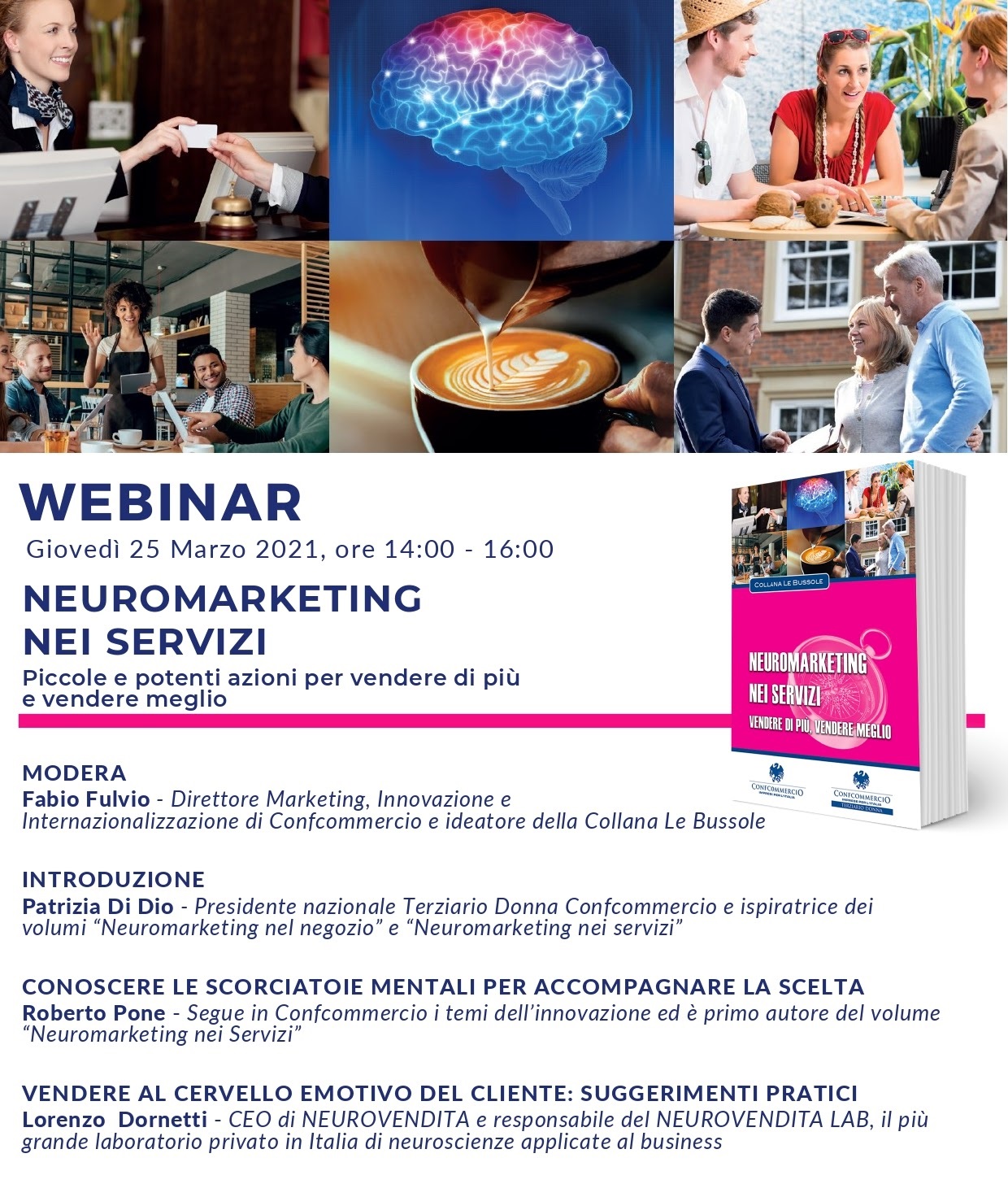 L'evento è stato pensato in occasione della presentazione a livello nazionale del nuovo volume delle BUSSOLE, collana edita da Confcommercio, “Neuromarketing nei Servizi. Vendere di più, vendere meglio” (volume disponibile gratuitamente per gli associati in formato e-book sul sito https://associati.confcommercio.it/profilo/)