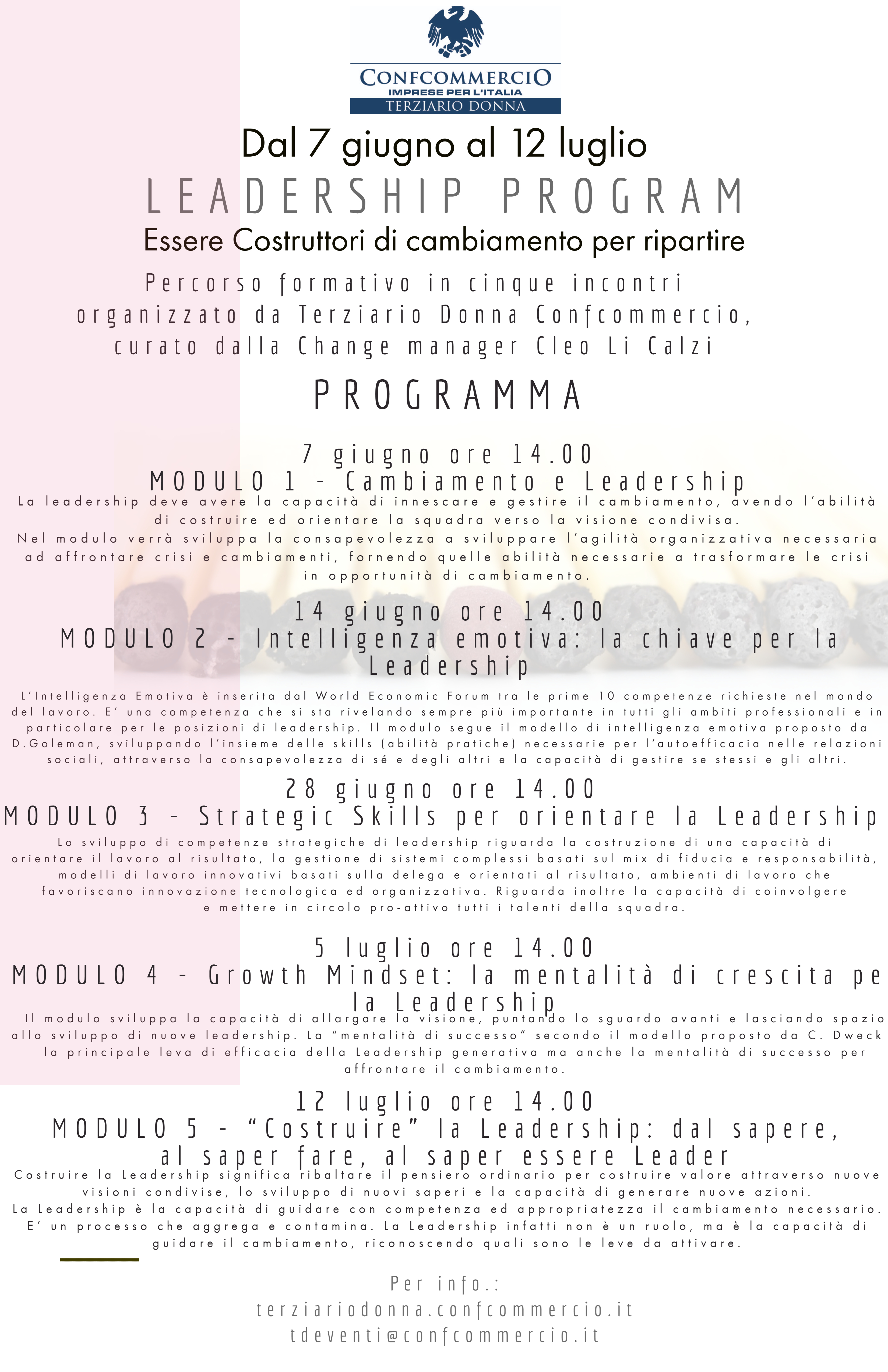 Questo il tema del percorso formativo organizzato da Terziario Donna nazionale a cura della della Change manager Cleo Li Calzi e che si articolerà in cinque incontri gratuiti on line a partire dal 7 giugno.