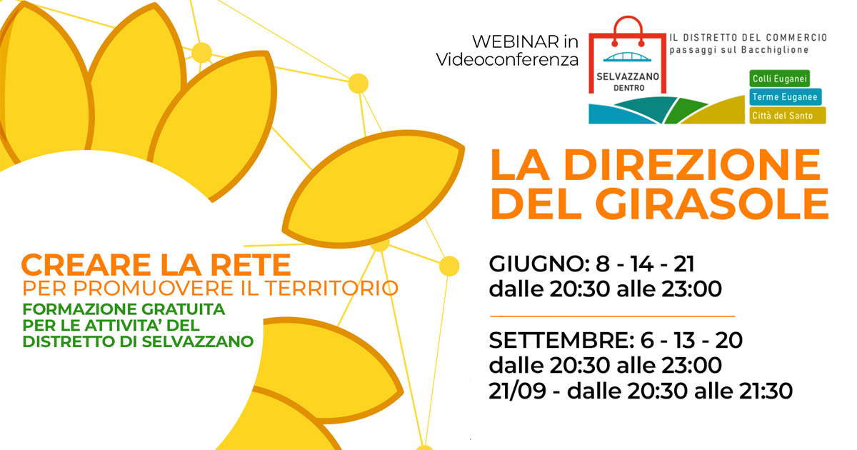 Da queste considerazioni nasce la progettazione degli incontri richiesti dal Distretto del Commercio di Selvazzano dal titolo “LA DIREZIONE DEL GIRASOLE” e realizzati con Ascom Servizi Formazione, cinque incontri online dall’8 giugno al 21 settembre per complessive 16 ore in fascia serale per approcciarsi ad un nuovo mindset.