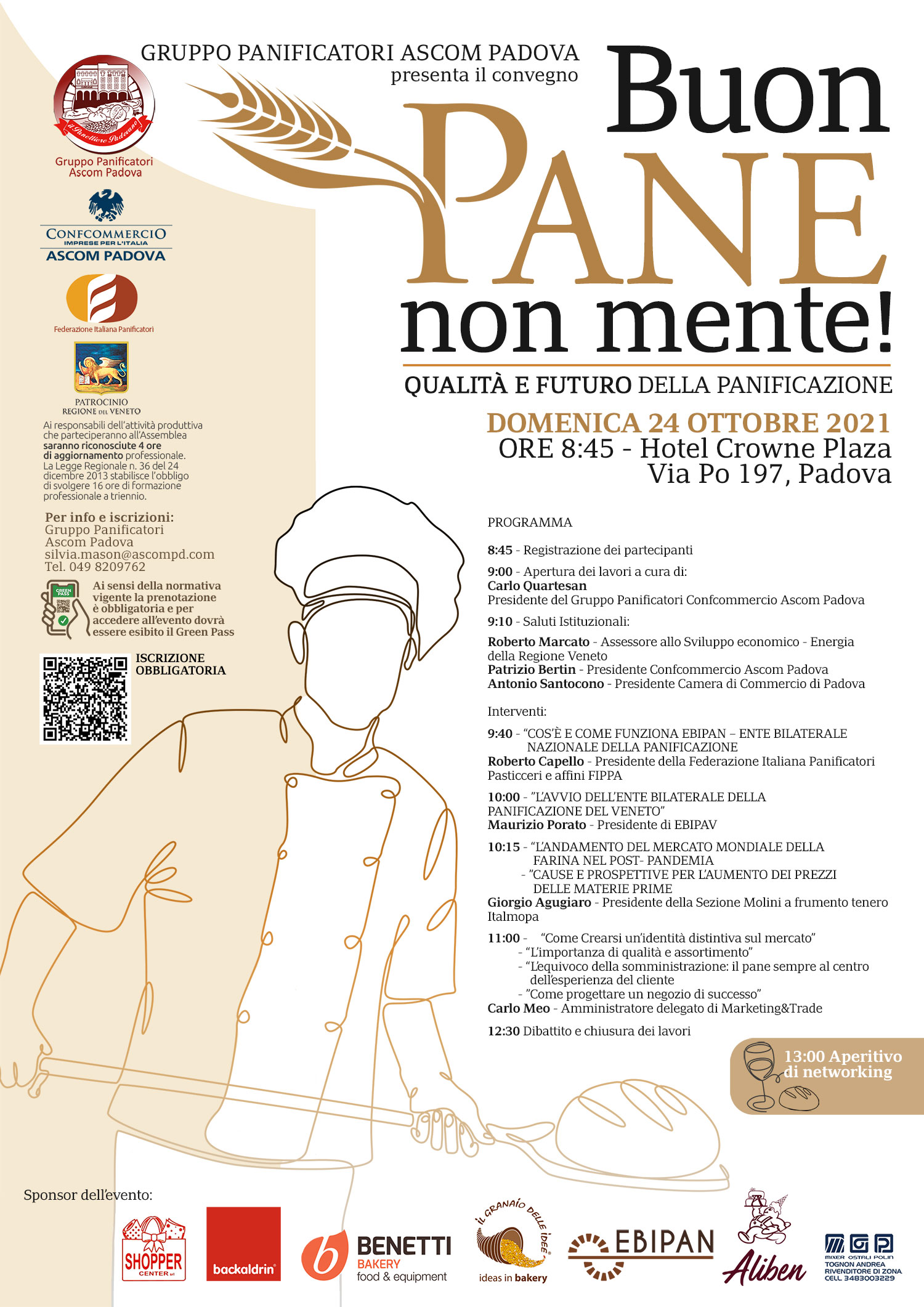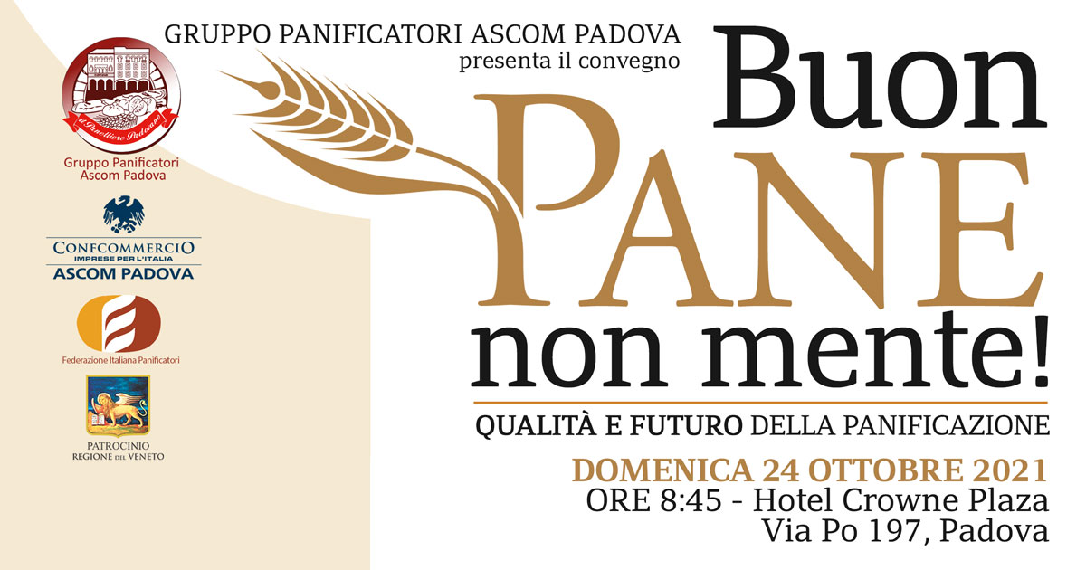 E’ previsto per Domenica 24 ottobre 2021 all’Hotel Crowne Plaza di Via Po, 197 Padova (uscita Padova Ovest dell'autostrada A4) alle ore 8.45 il primo convegno in presenza organizzato dal Gruppo Panificatori di Confcommercio Padova post Covid.