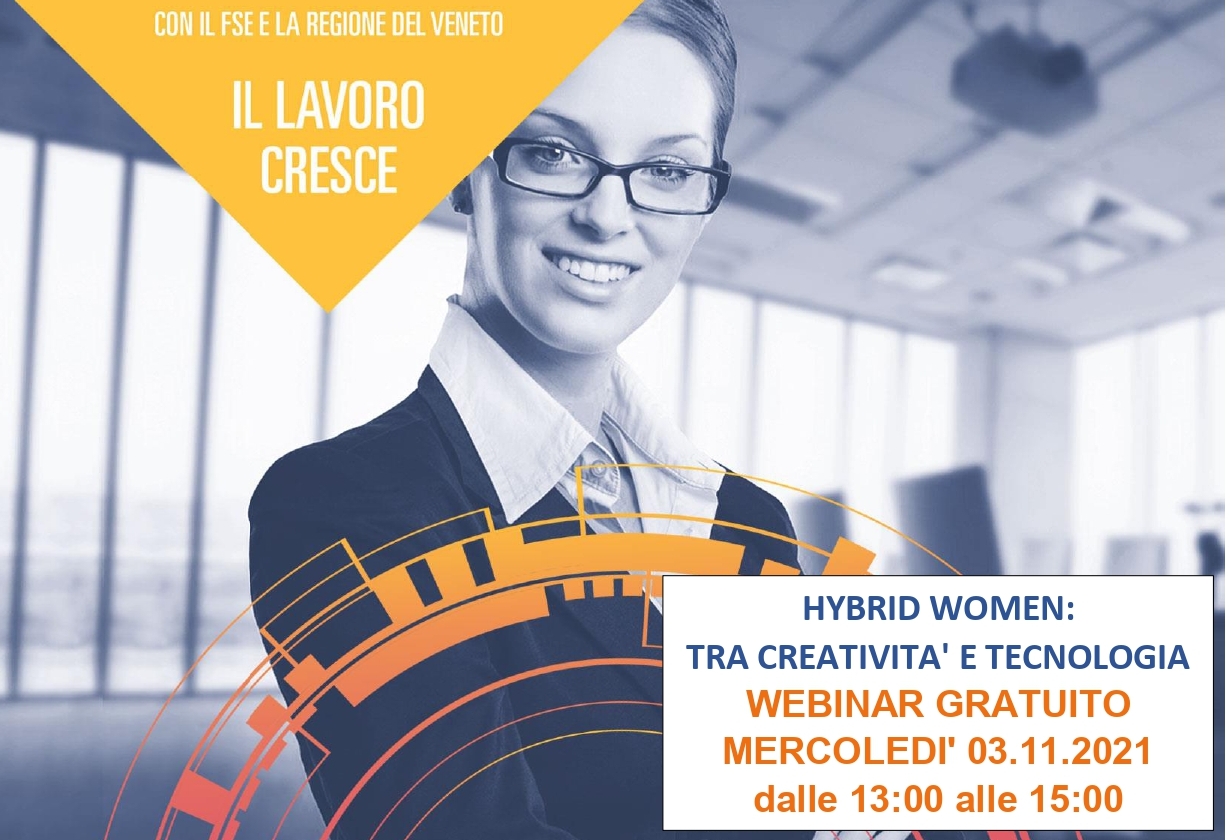 L'Ascom Servizi Padova spa, con il Fondo Sociale Europeo e la Regione Veneto, organizza il webinar gratuito "HYBRID WOMEN: TRA CREATIVITA' E TECNOLOGIA", mercoledì 3 novembre, dalle ore 13.00 alle ore 15.00.