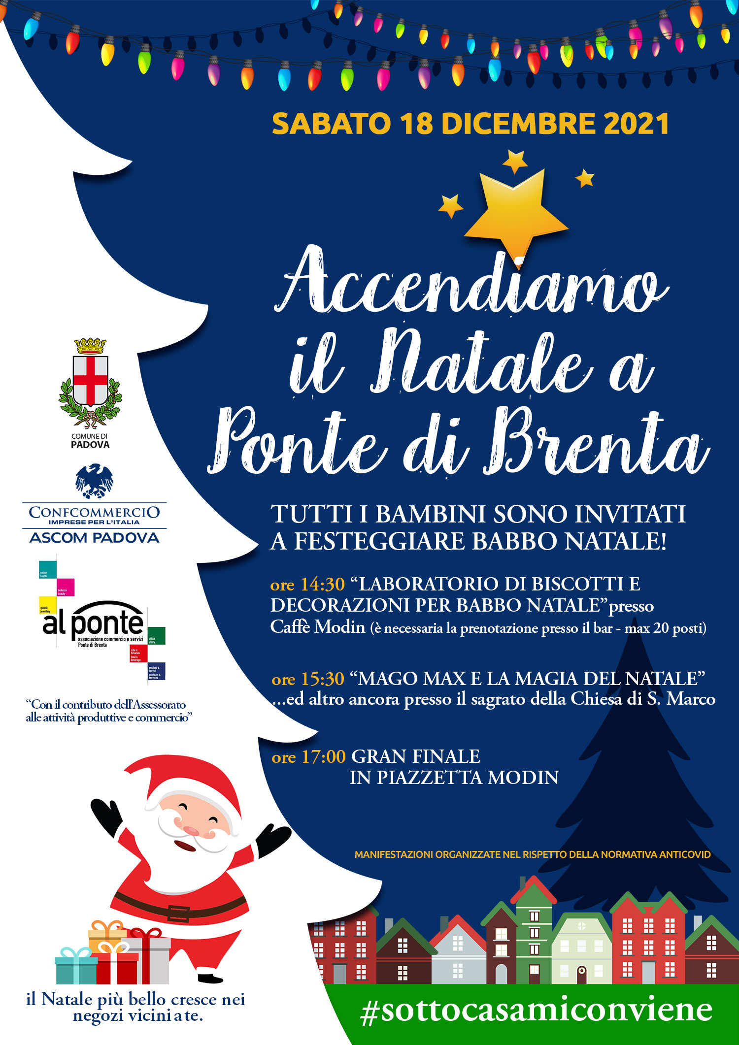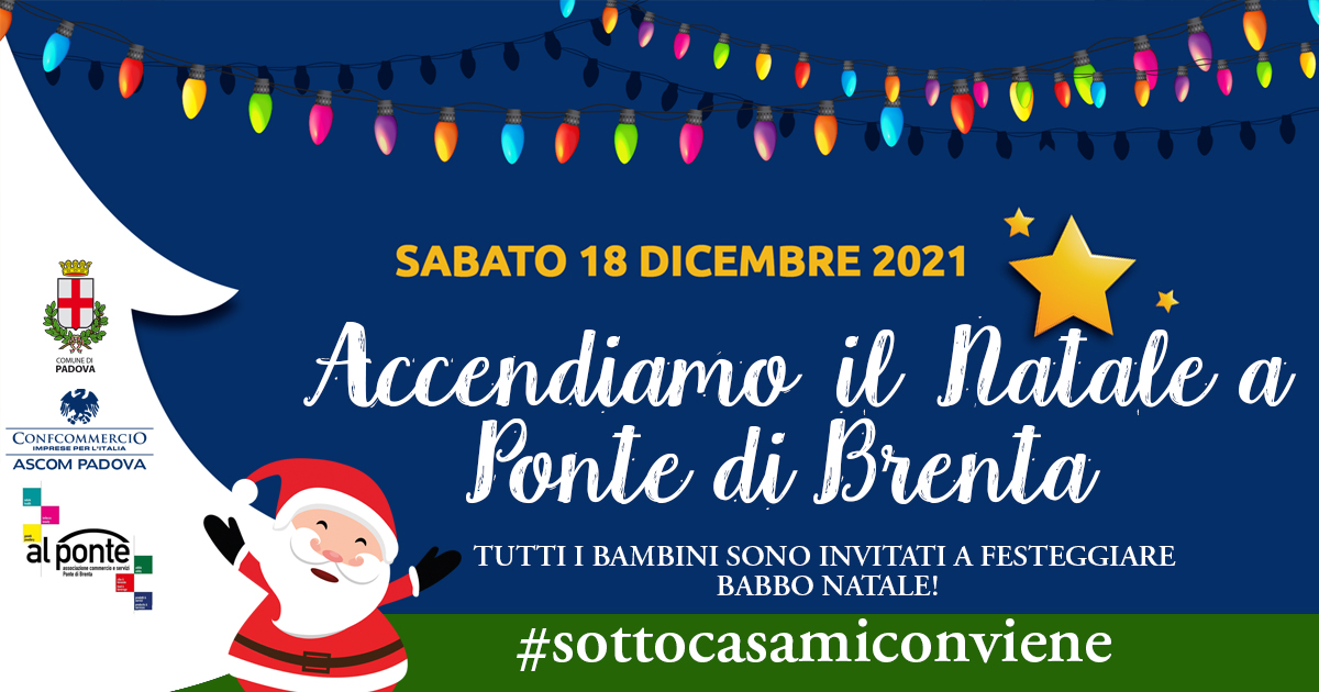 Sabato 18 novembre 2021 sarà a Ponte di Brenta un'intera giornata dedicata al Natale e ai più piccoli. Numerose saranno le iniziative messe in campo, grazie al Comune di Padova e la Confcommercio Ascom Padova, con il contributo dell'Assessorato alle attività produttive e commercio.