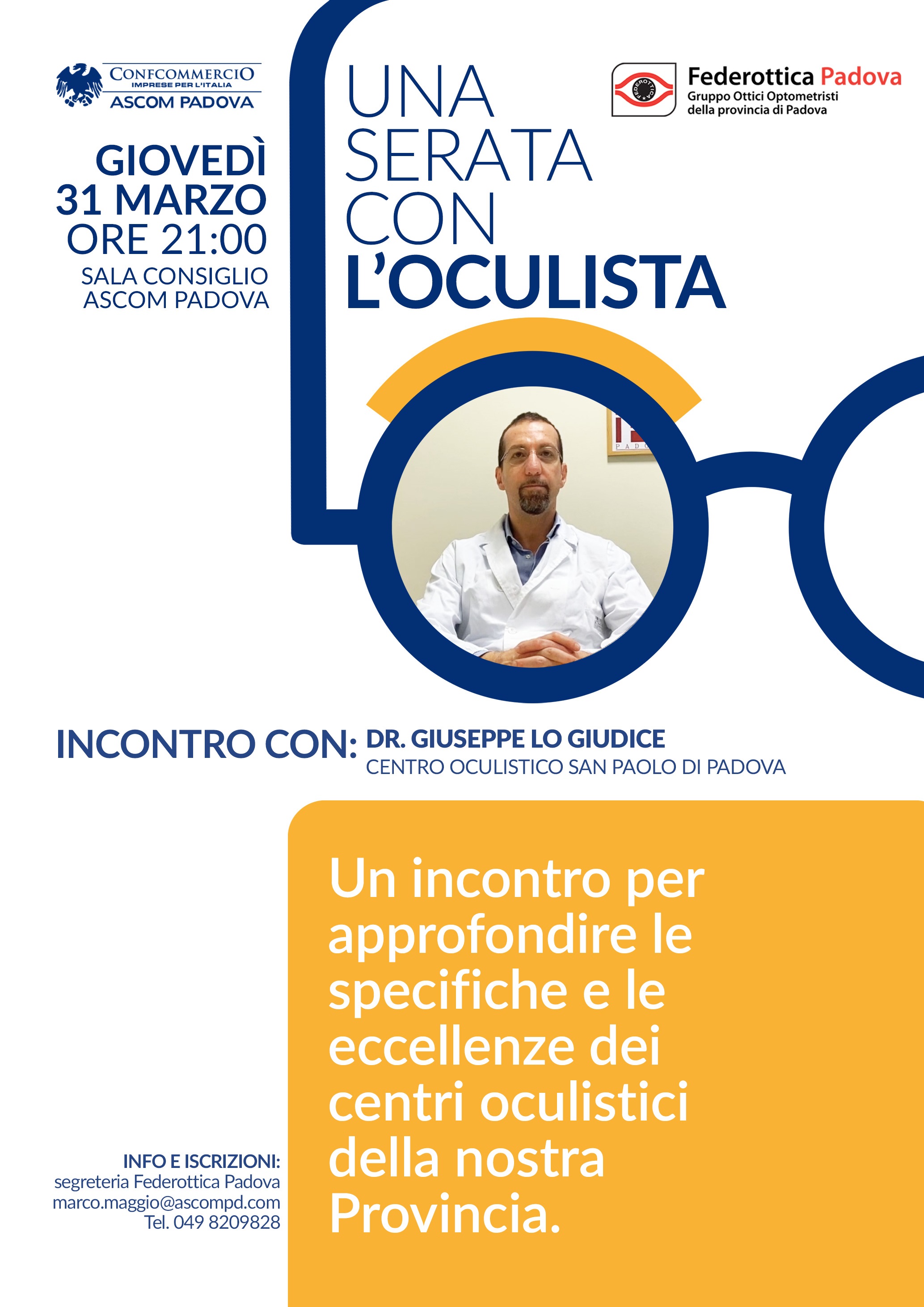 Giovedì 31 marzo p.v. alle ore 21,00 nella sede dell'ASCOM di Padova in Padova P.zza Bardella, 3 (Sala Consiglio) è previsto il primo appuntamento del 2022 di “Una serata con l’Oculista”, il ciclo di incontri - riservati ai soli soci di Federottica Padova - finalizzati ad approfondire le specifiche e le eccellenze dei centri oculistici della nostra provincia.