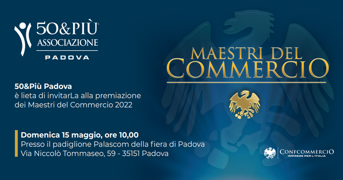 Sarà il PALASCOM in Fiera Campionaria ad ospitare, domenica prossima, 15 maggio, alle 10, la premiazione dei “Maestri del Commercio” manifestazione organizzata da 50&Più Ascom Confcommercio Padova, il raggruppamento dei senior del commercio, del turismo e dei servizi.