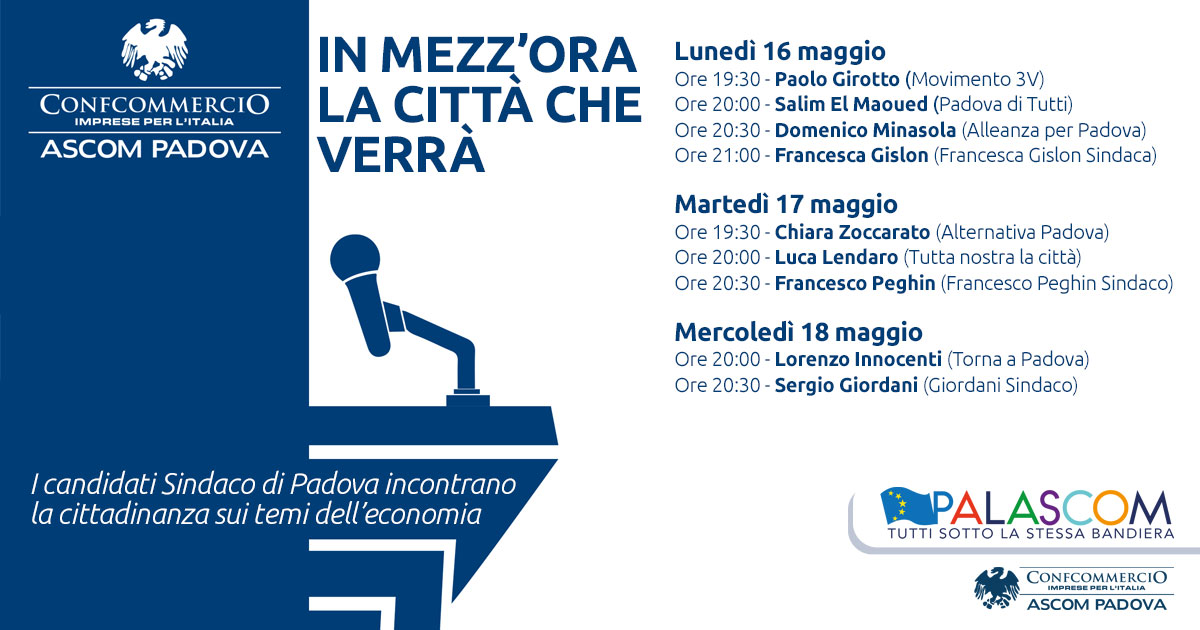 “Mezz’ora per dirci come intendono sviluppare la Padova del futuro, con un occhio di riguardo alle scelte in campo economico – ha detto in sede di presentazione il presidente dell’Ascom Confcommercio, Patrizio Bertin – ovviamente ponendo un accento particolare sul terziario di mercato, vale a dire il commercio, il turismo e i servizi”.