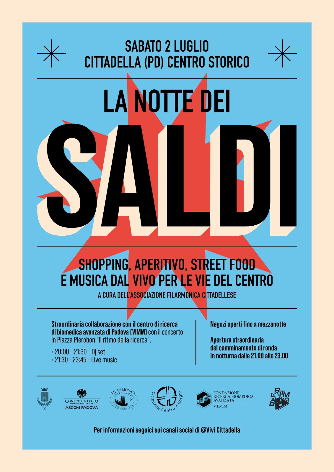 Sabato 2 luglio a Cittadella si terrà una serata promozionale per la Fondazione Ricerca Biomedica Avanzata VIMM nell’ambito dell’evento La Notte dei Saldi, che vedrà il centro storico di Cittadella animarsi grazie a ad iniziative di shopping, aperitivi, street food e musica dal vivo per le vie del centro, a cura dell’Associazione Filarmonica Cittadellese.