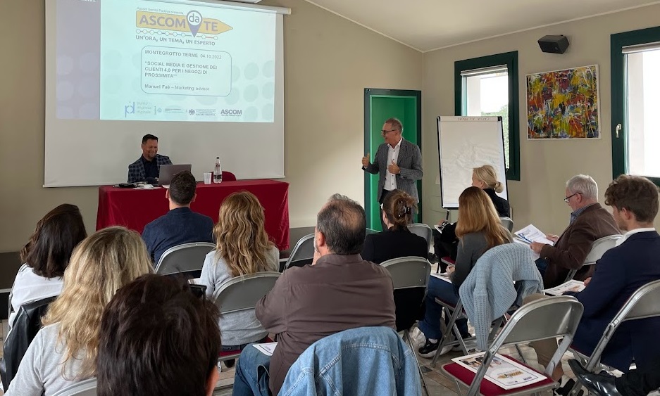 Buon successo di pubblico per l’evento Ascom Da Te dedicato all’analisi del tema “SOCIAL MEDIA E GESTIONE DEI CLIENTI 4.0 PER I NEGOZI DI PROSSIMITA’”, realizzato all’interno della prestigiosa struttura Y-40 presso Hotel Millepini a Montegrotto Terme, con l’intervento di Manuel Faè, marketing advisor e autore di “NEXTGOZIO, commercio al dettaglio nell'era digitale”, organizzato da Ascom Servizi Padova spa con la Camera di Commercio nell’ambito del Progetto PID.