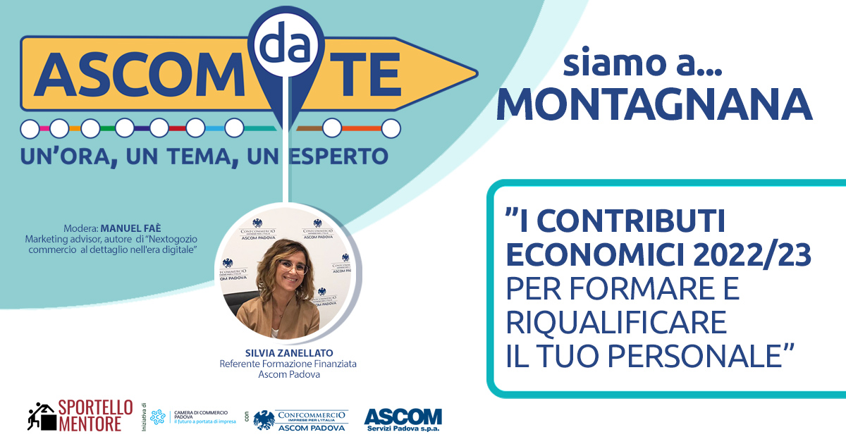 Si terrà domani, giovedì 27 ottobre alle 15.30 l’evento “Ascom Da Te” organizzato da Ascom Servizi Padova spa in collaborazione con la Camera di Commercio di Padova nell’ambito del progetto Mentore.